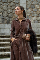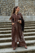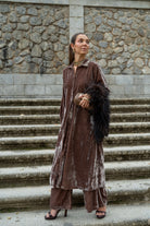 Set consisting of a long-sleeved, buttoned kaftan and elasticated waist trousers with side pockets. In taupe.