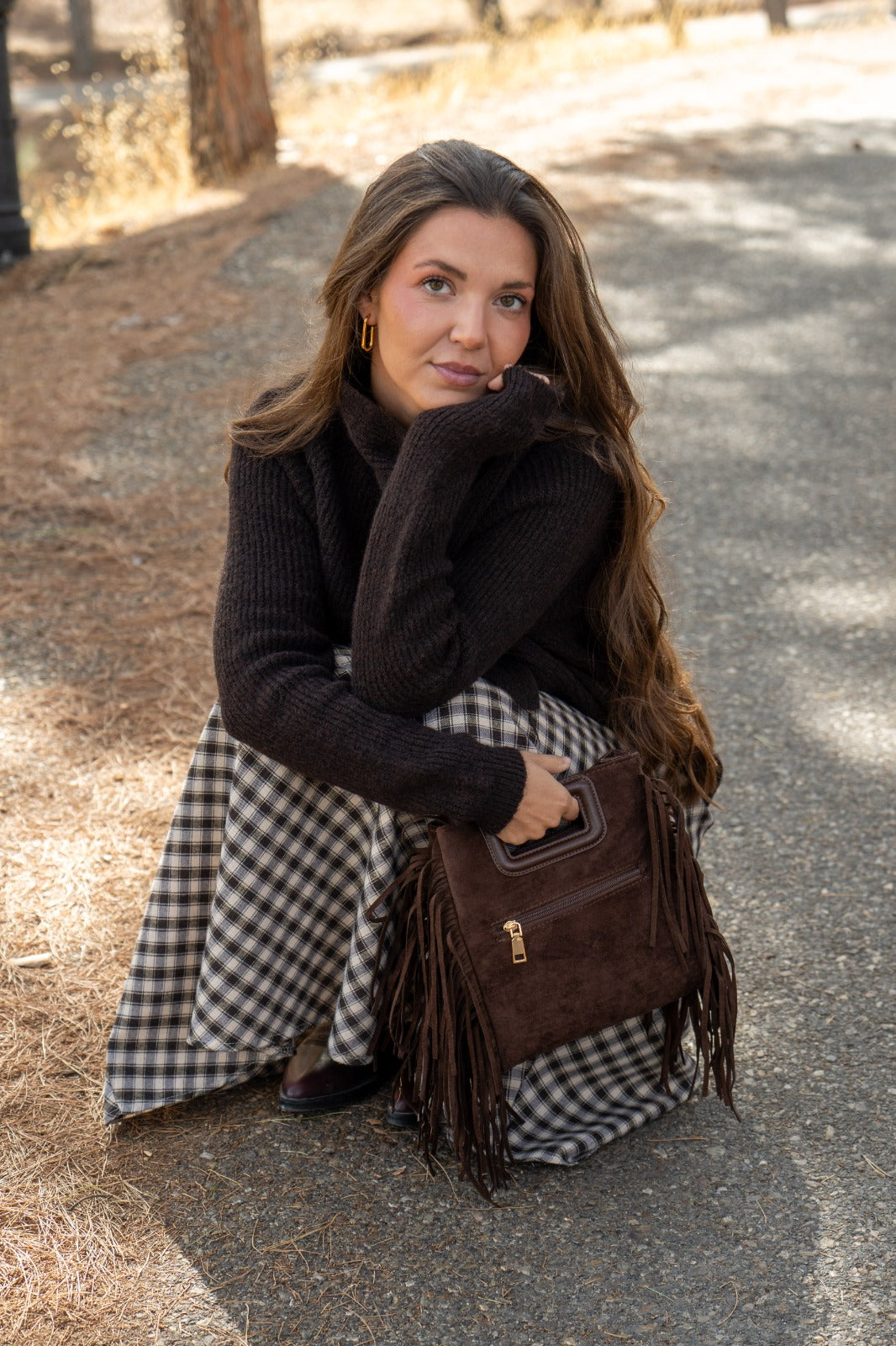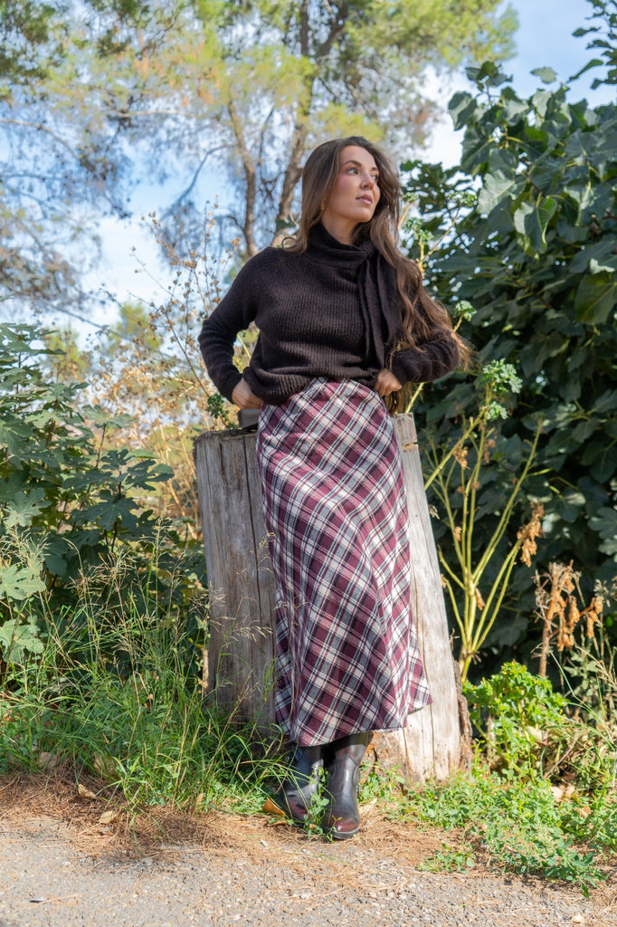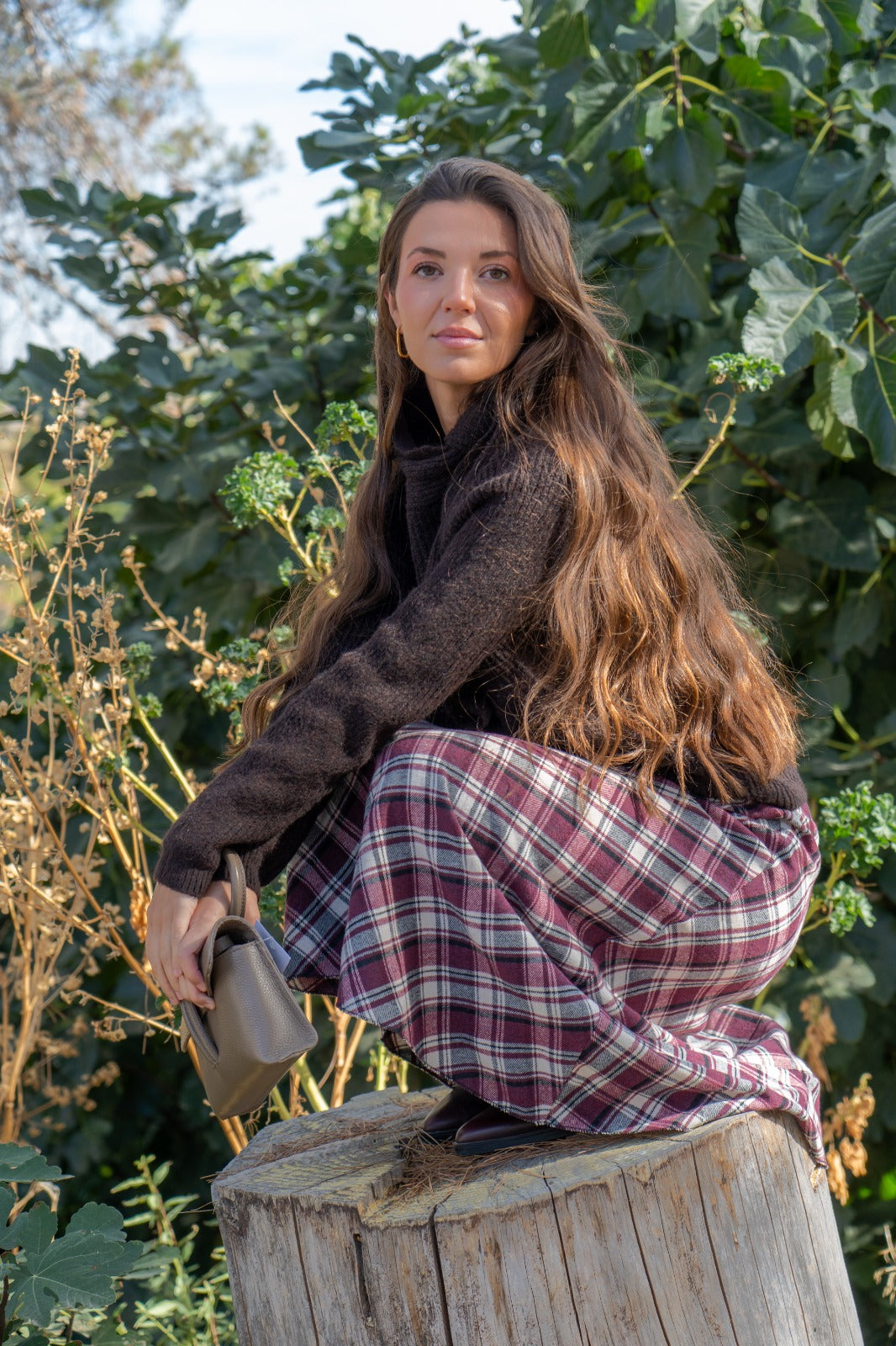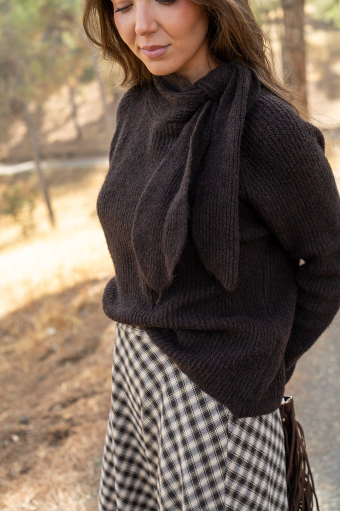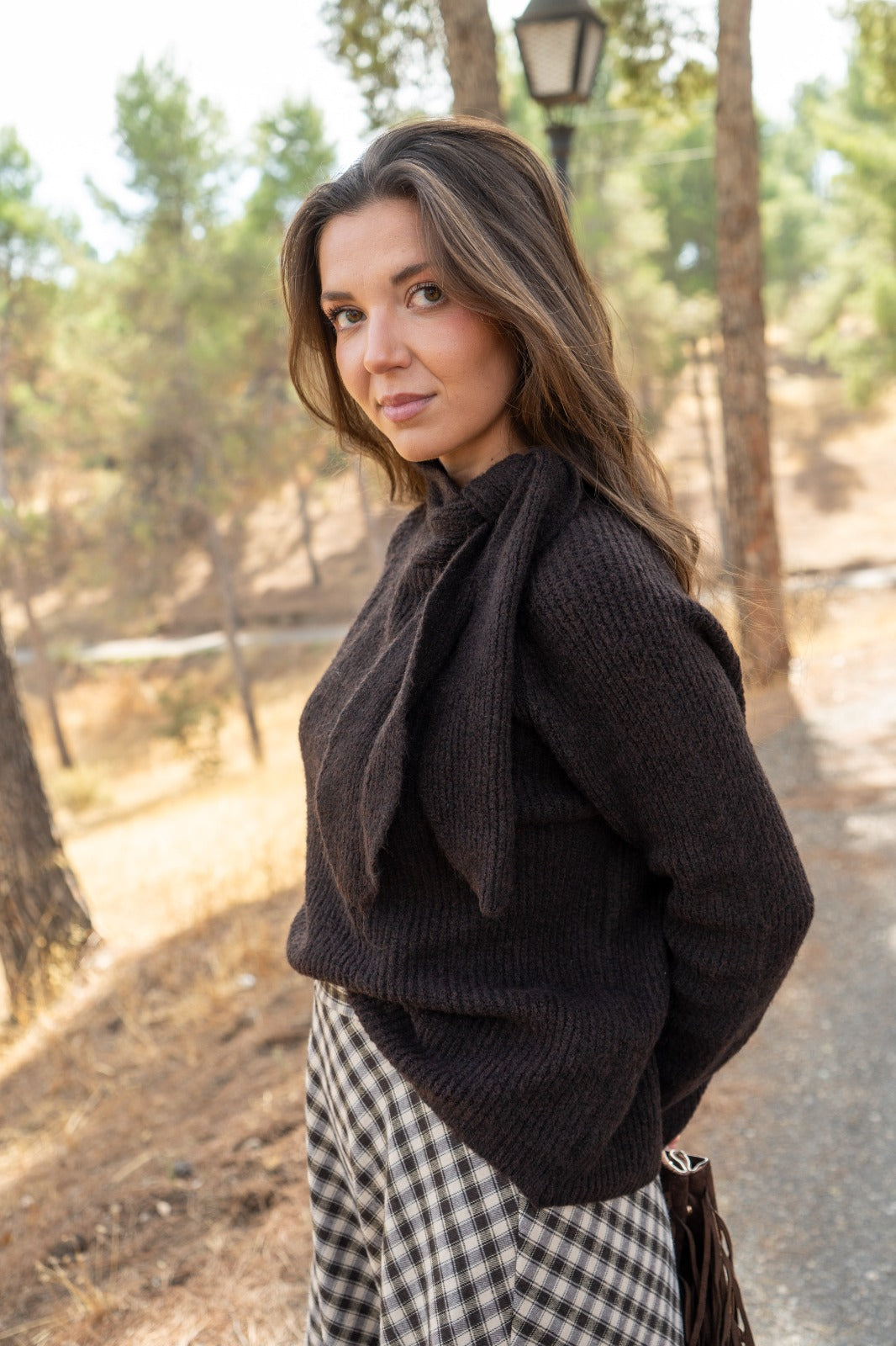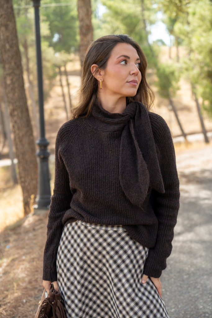 Soft sweater, long sleeves, high neck with bow, in brown.