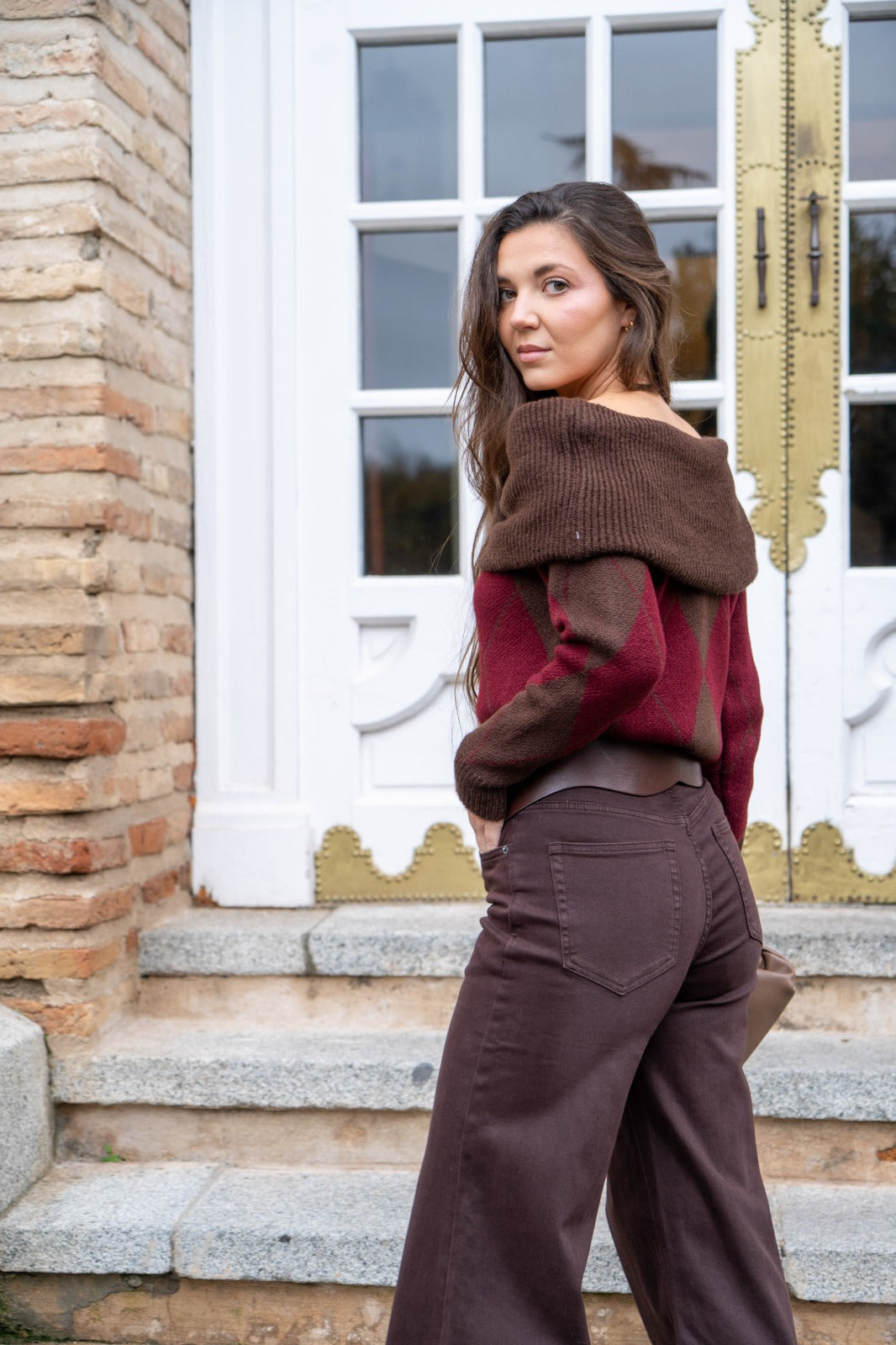 Jersey cuello bartot, manga larga con puño, en color marrón con rombos burdeos.