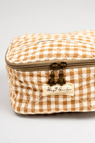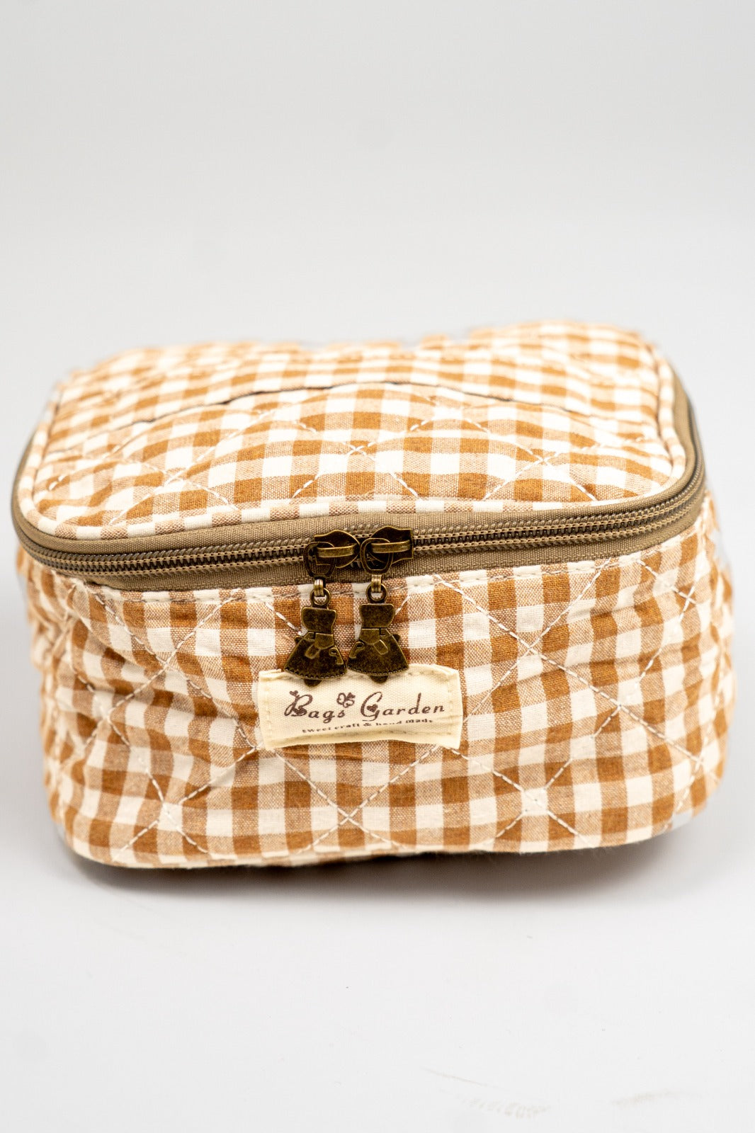 Toiletry bag with zip closure, handle at the top, interior pockets, in white and brown gingham.