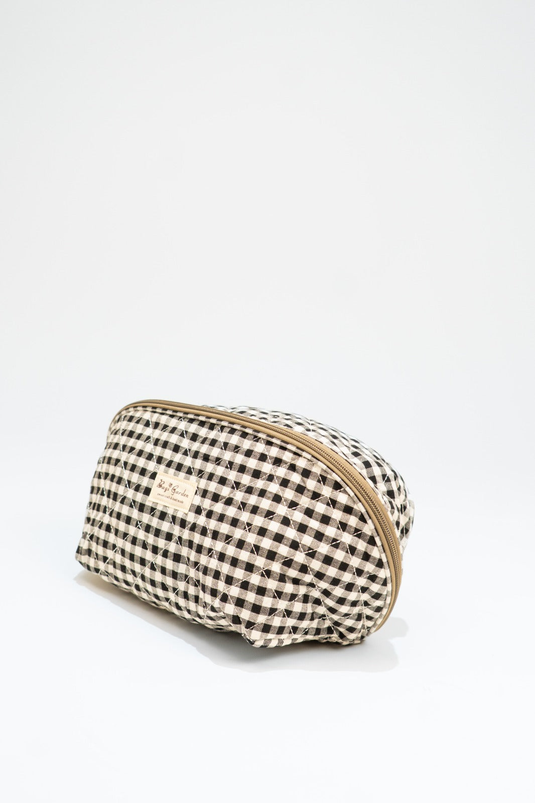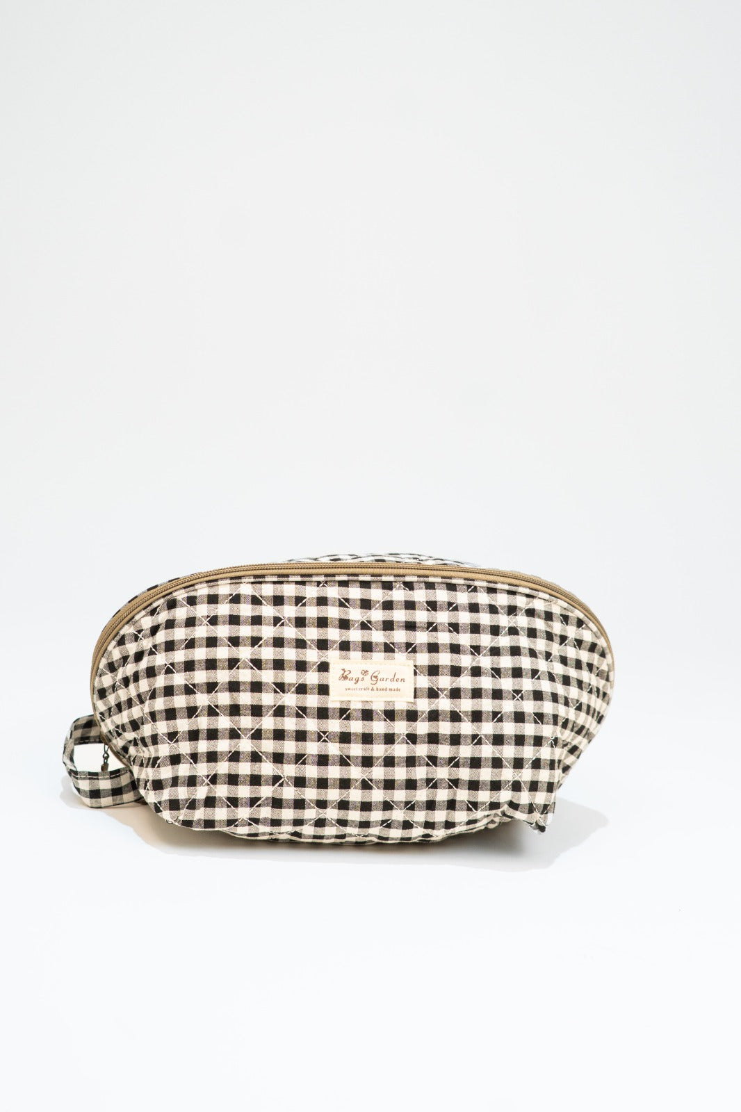 Toiletry bag with zip closure, handle on one side, interior pockets, in black and white gingham.