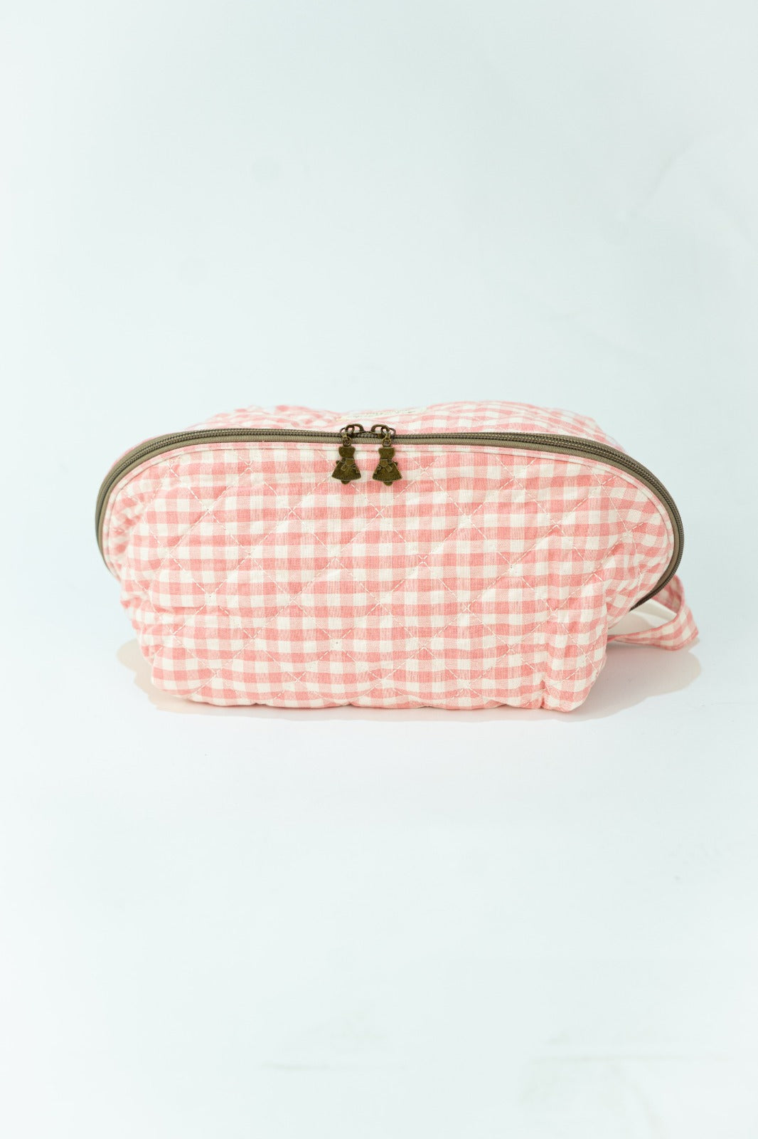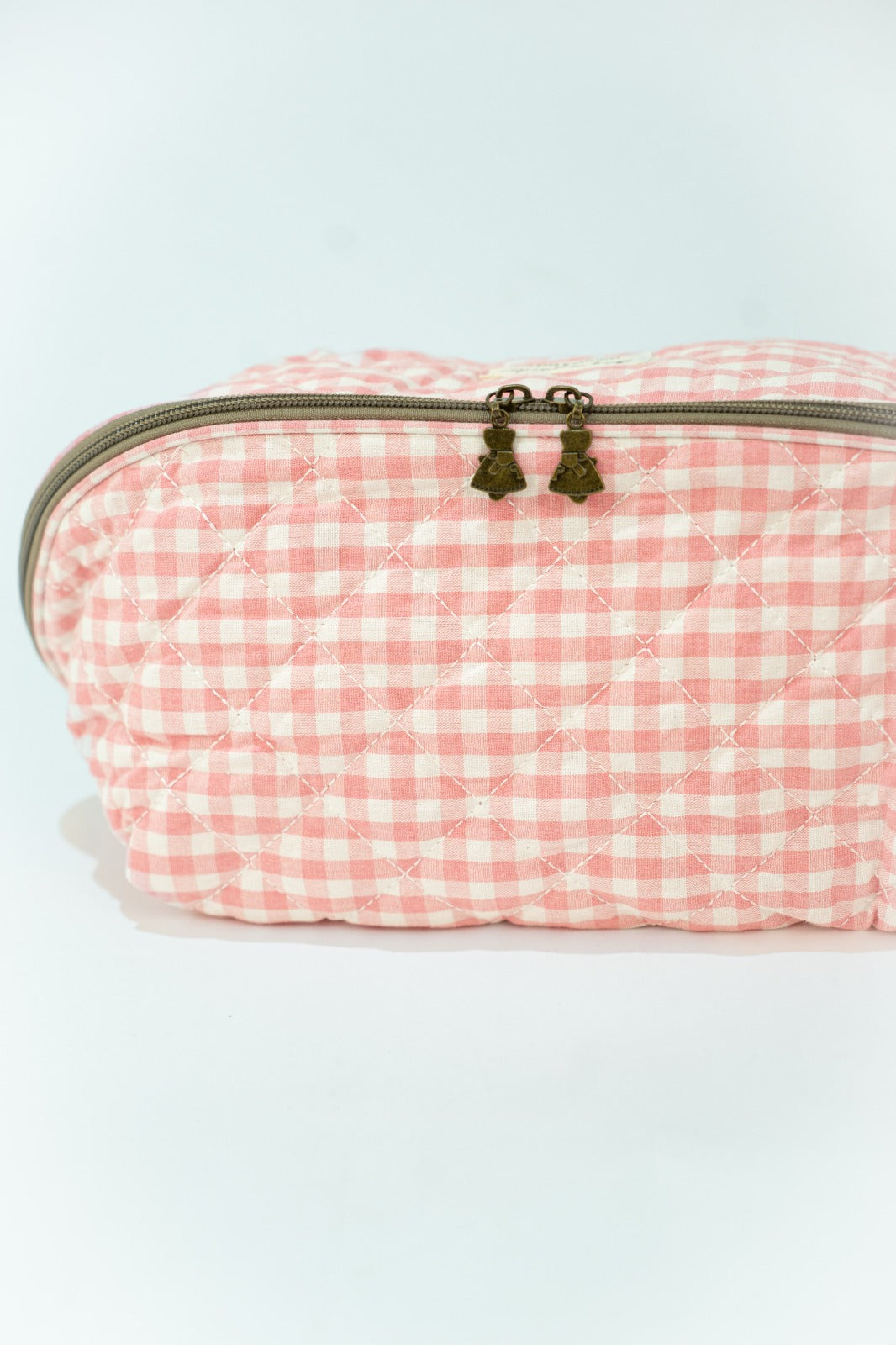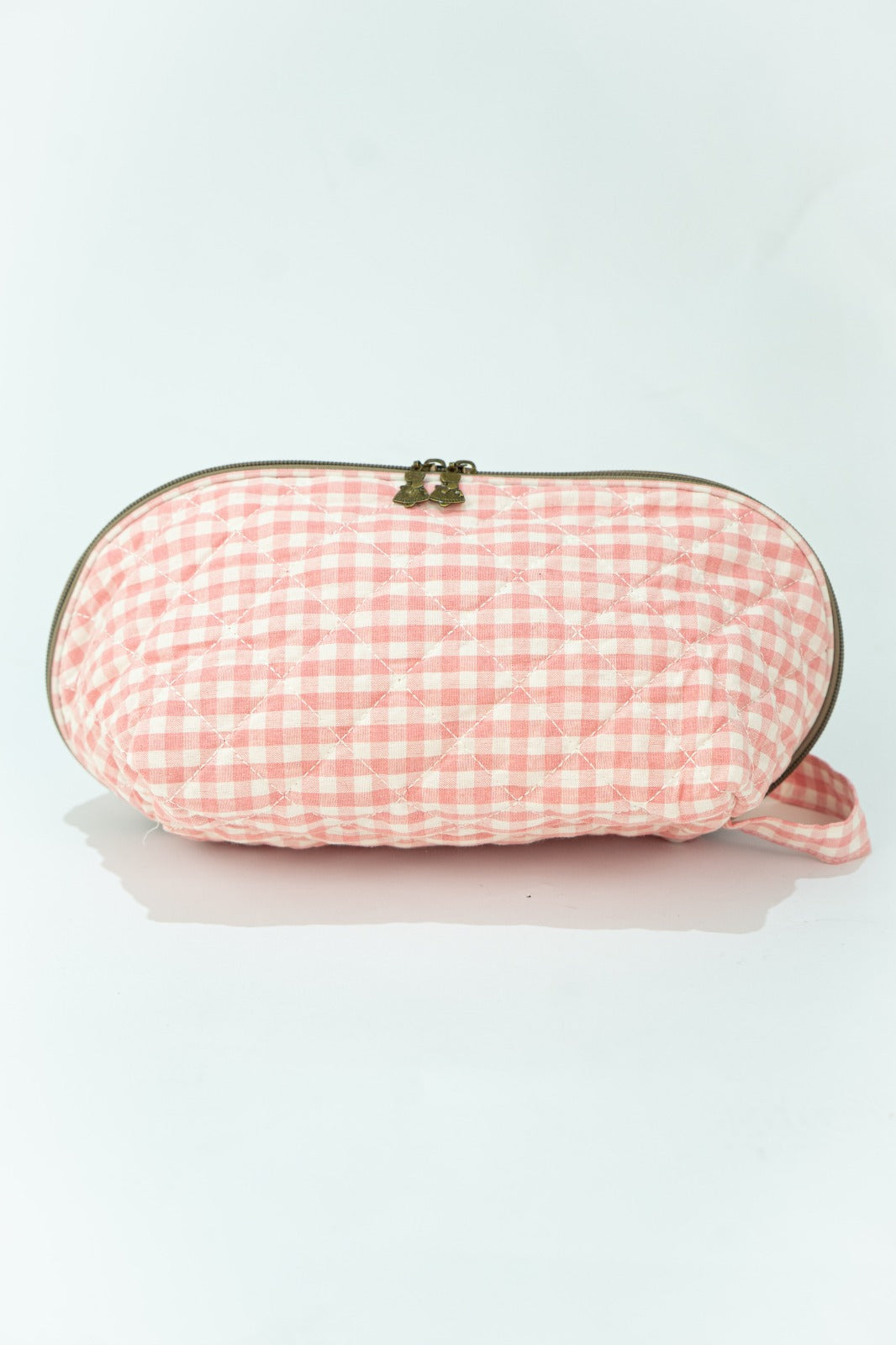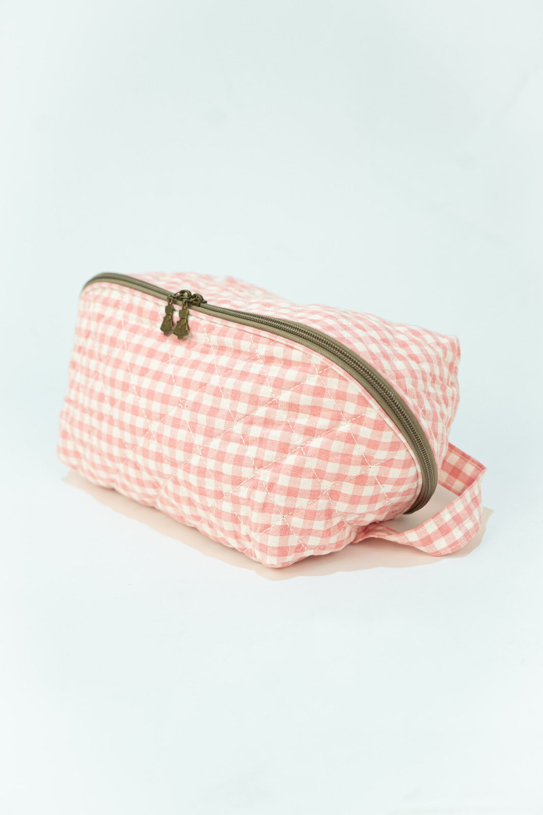 Toiletry bag with zip closure, handle on one side, interior pockets, in white and pink gingham.