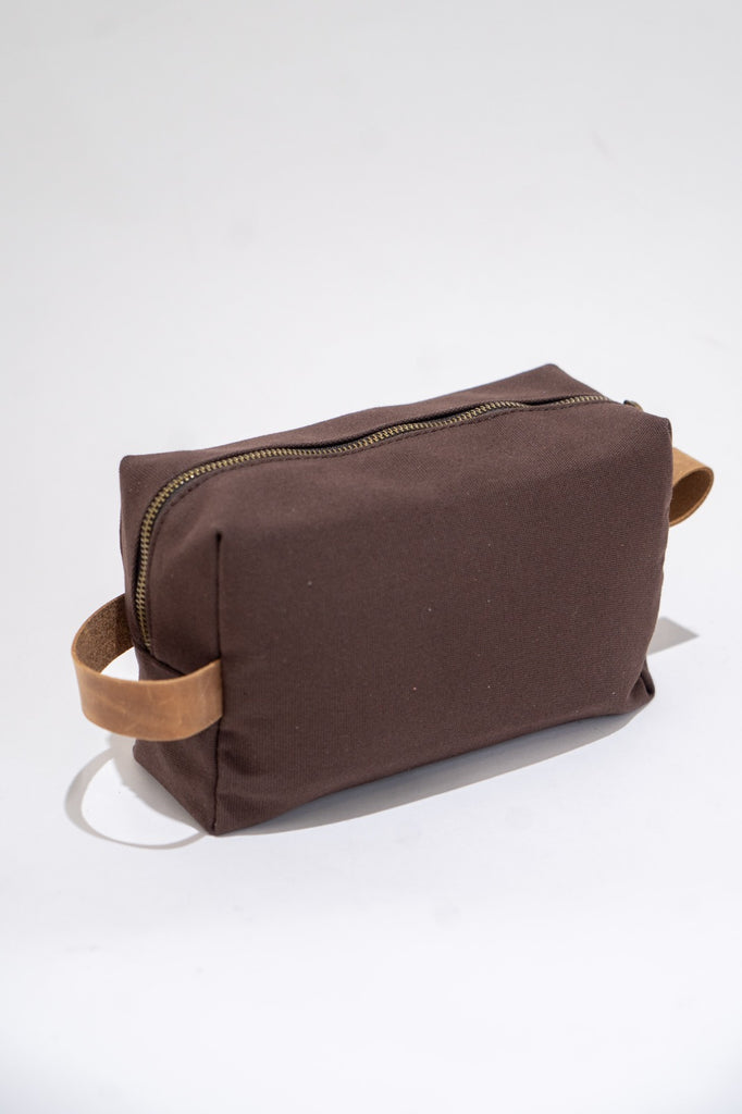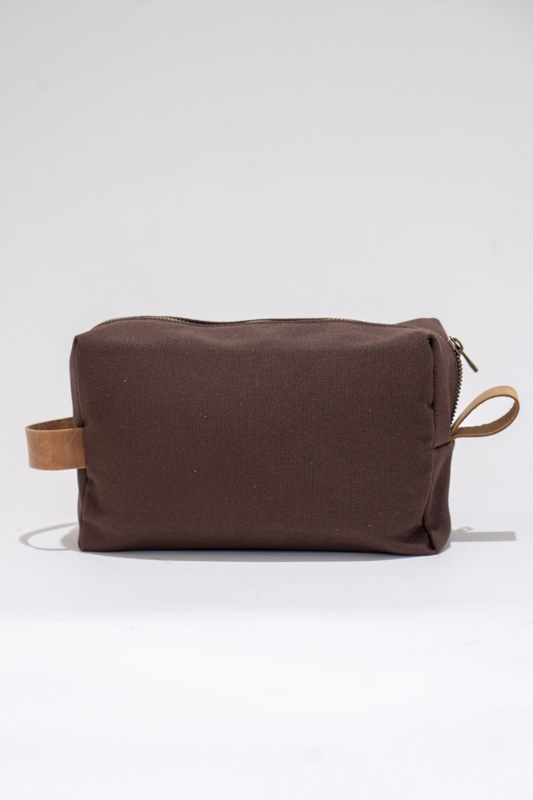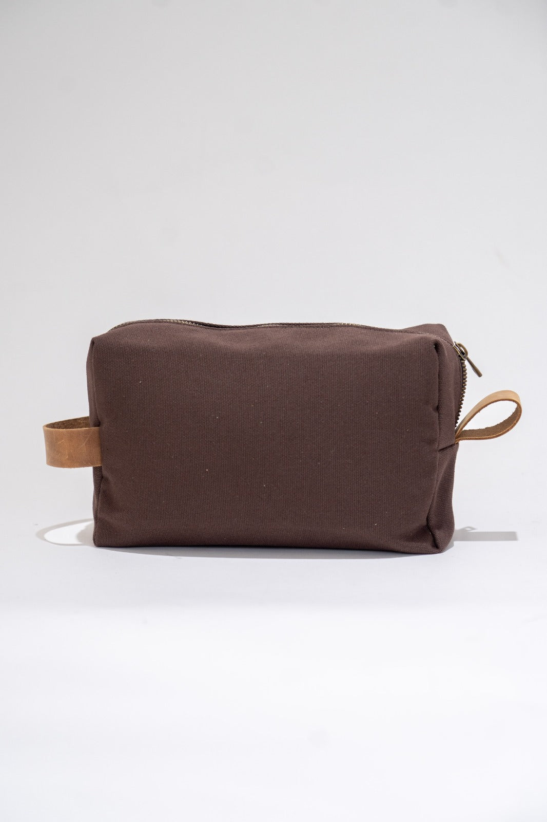 Bolsa de aseo, neceser rectangular, cierre con cremallera, asa a los lados, en color marrón.