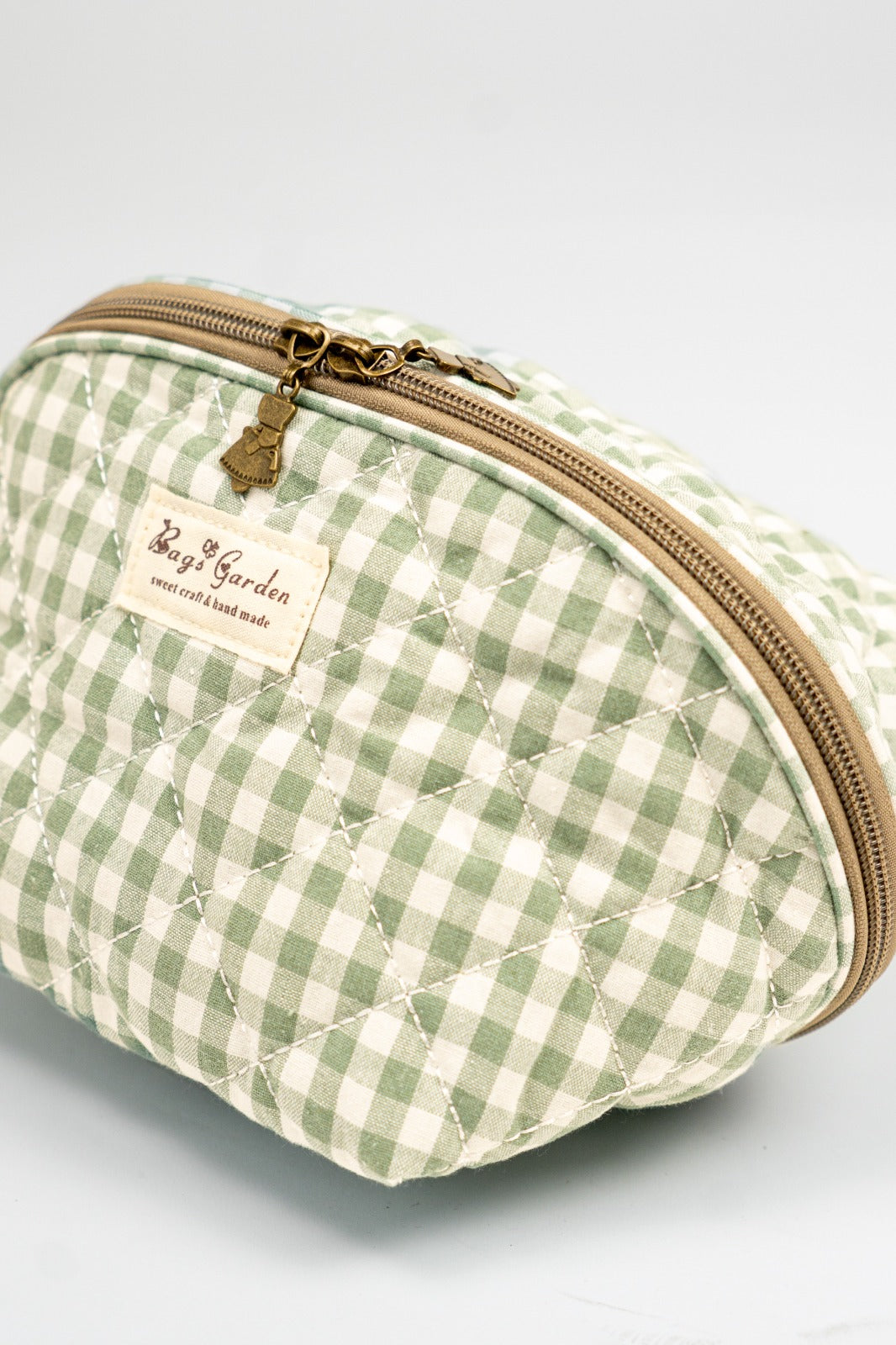 Toiletry bag with zip closure, handle on one side, in white and green gingham.