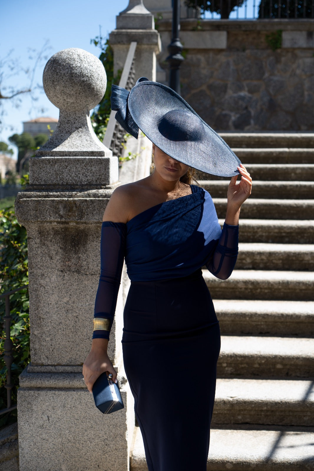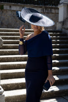 Pamela with a silk sinamay base, complemented by an elegant blue sinamay bow.