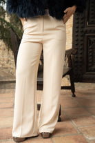 High-waisted trousers, side pockets, wide leg, in beige.