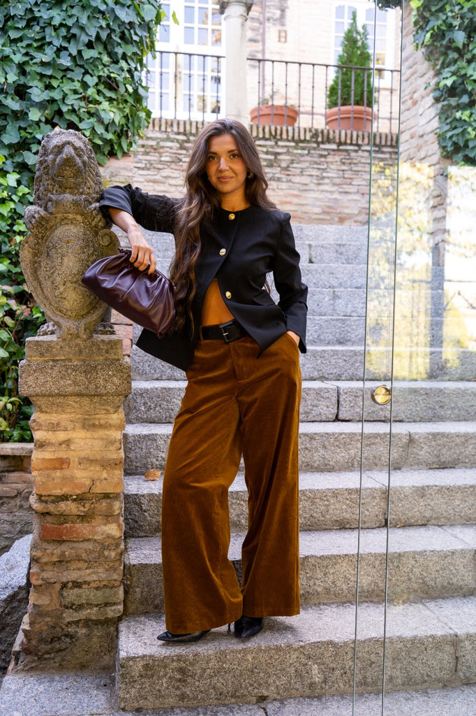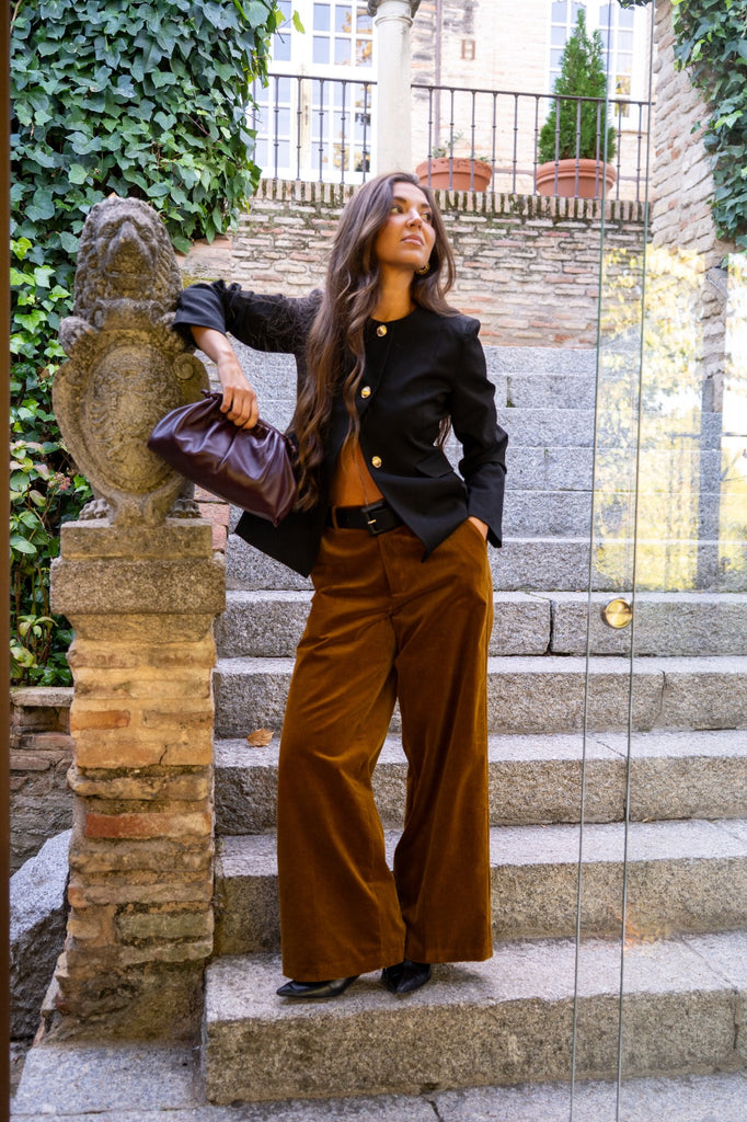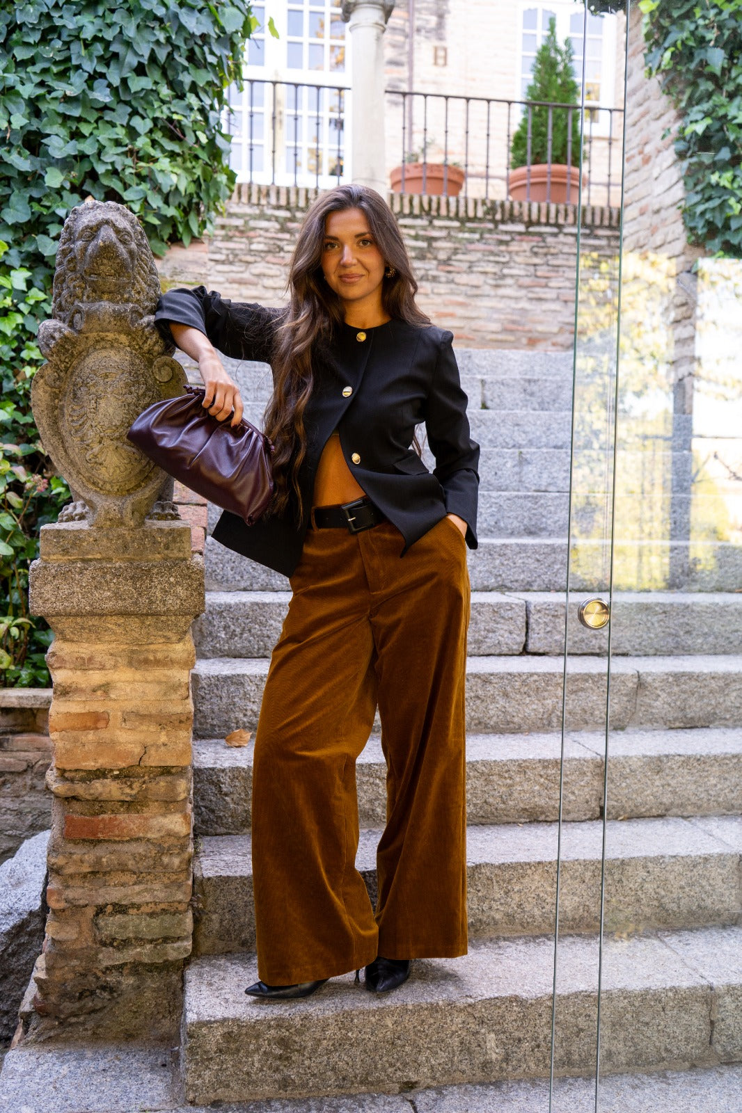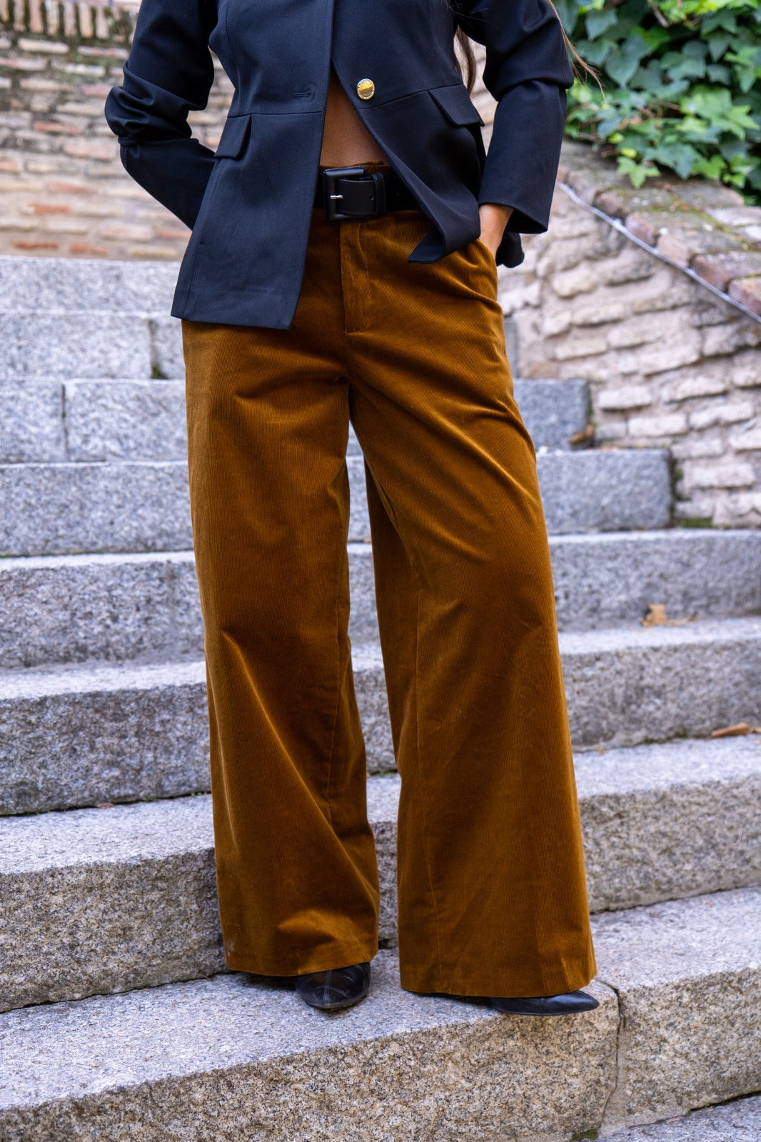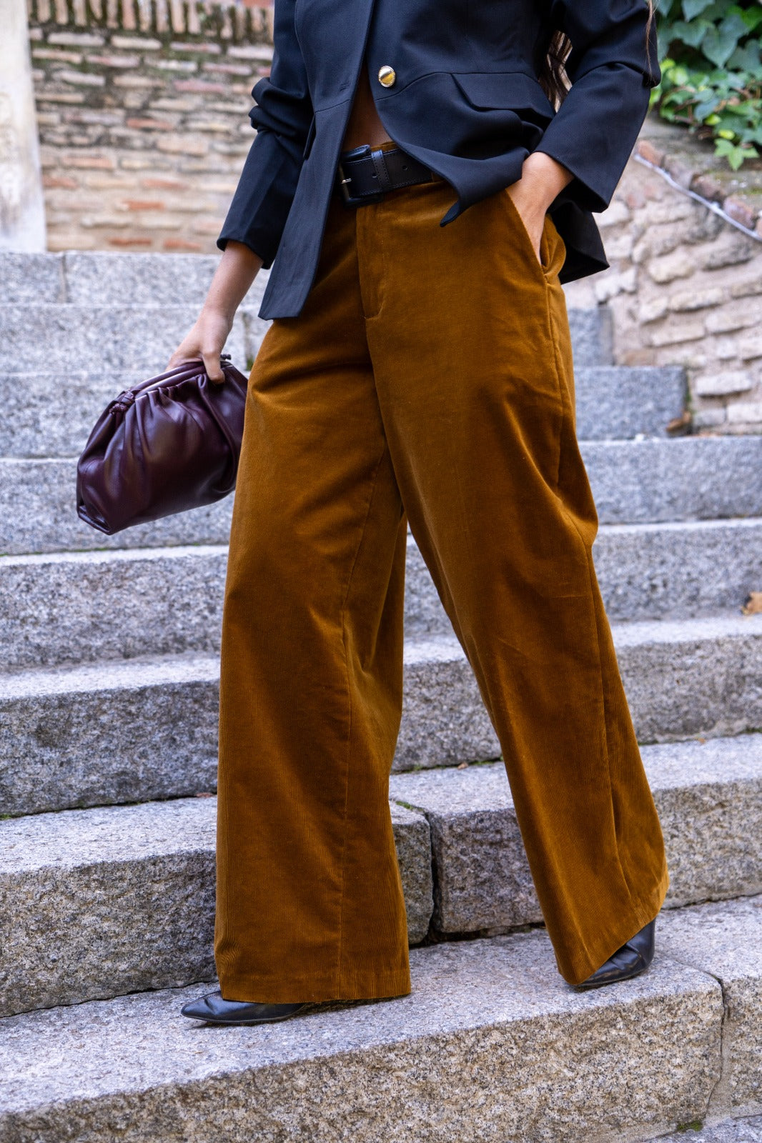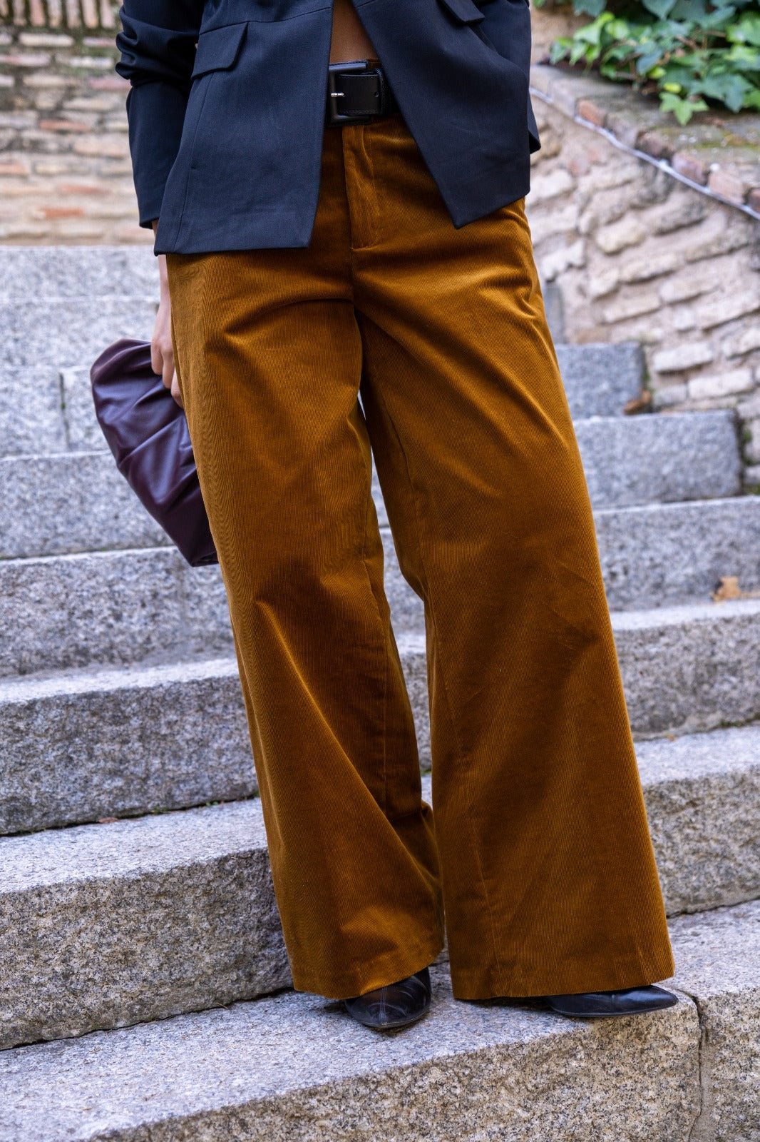 Pantalón pana, bolsillos laterales y traseros, ancho. En color mostaza.