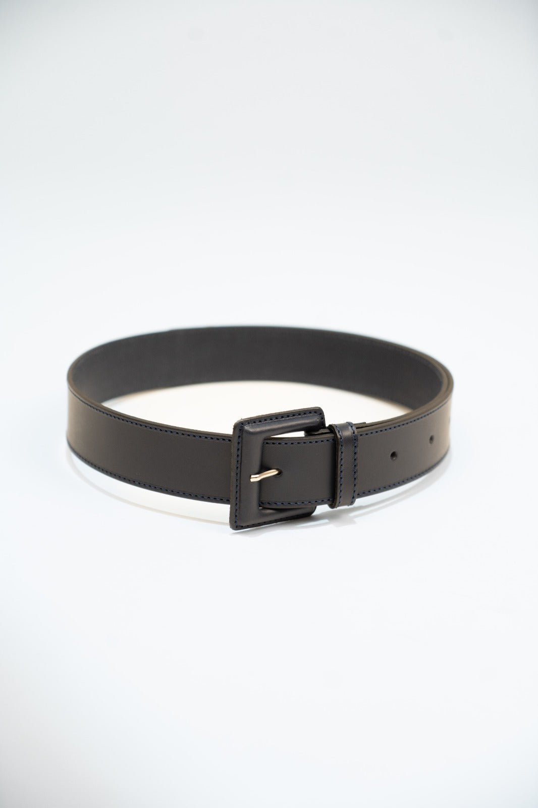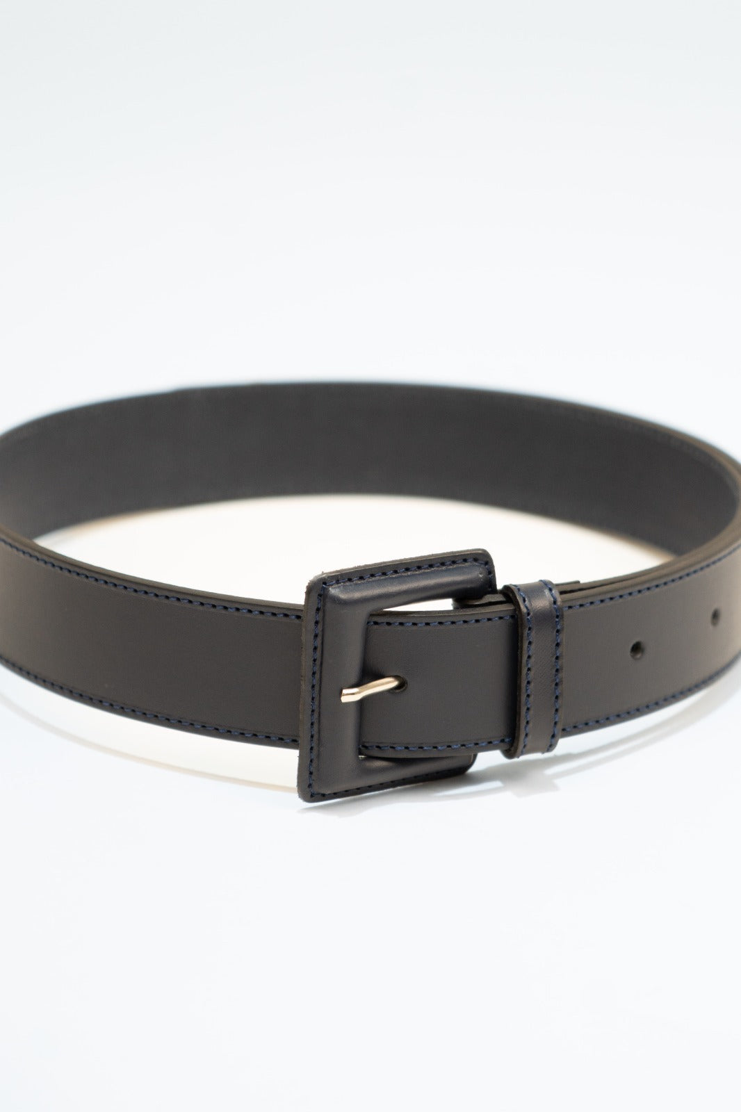 Belt made of navy blue leather. Front closure with leather-covered buckle.