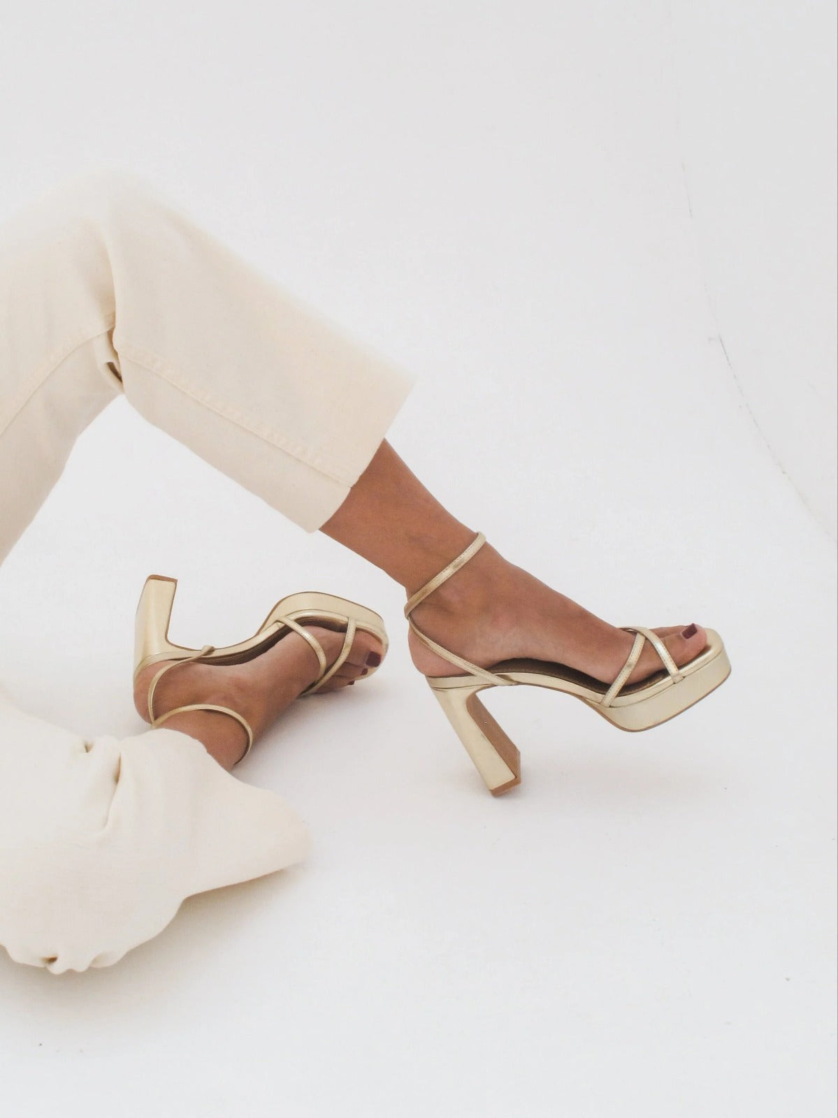 Sandalia de tacón con plataforma color dorado con tiras. Cierre en el tobillo con hebilla.