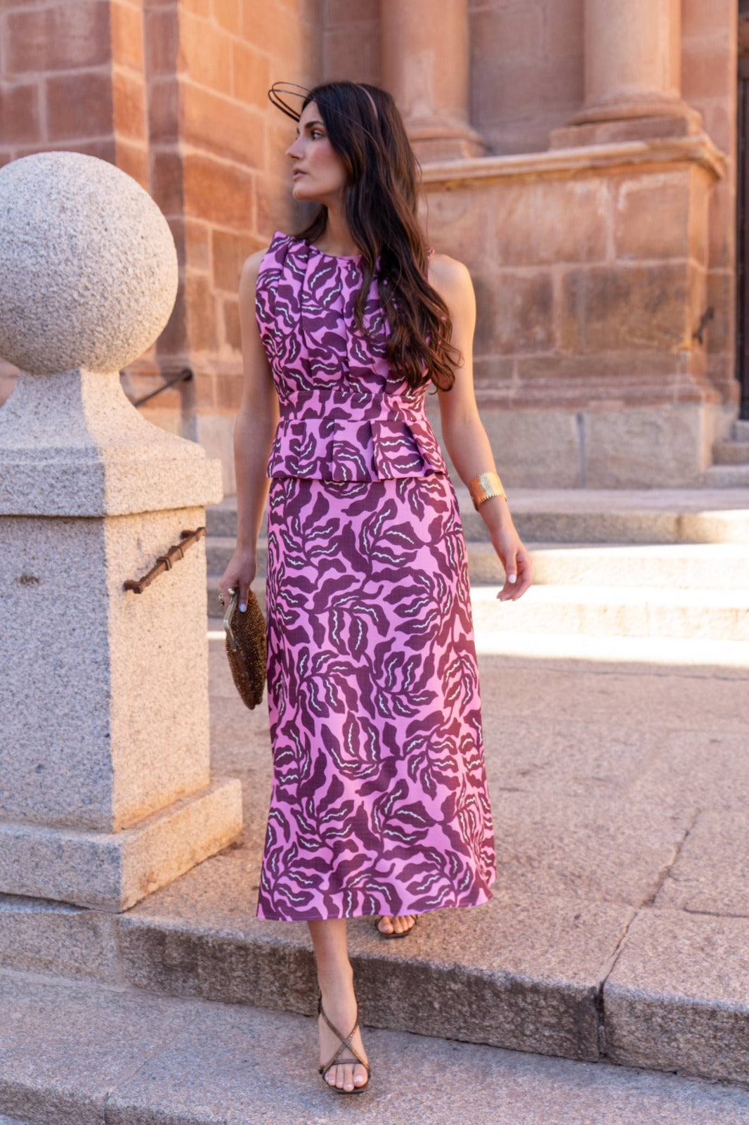 Midi dress, round neckline, sleeveless, cut at the waist, flared hem. In printed color.