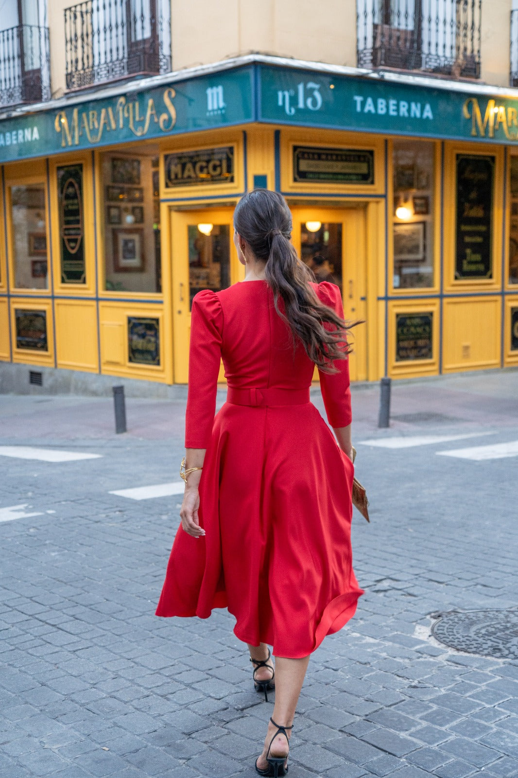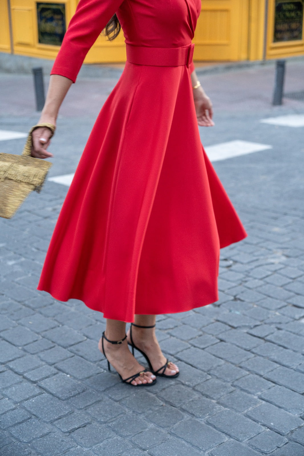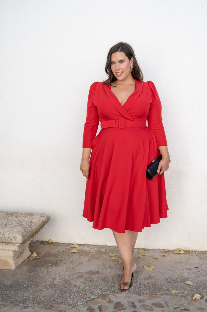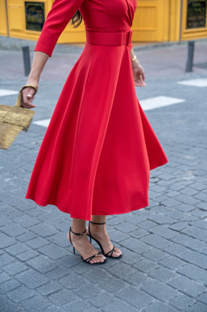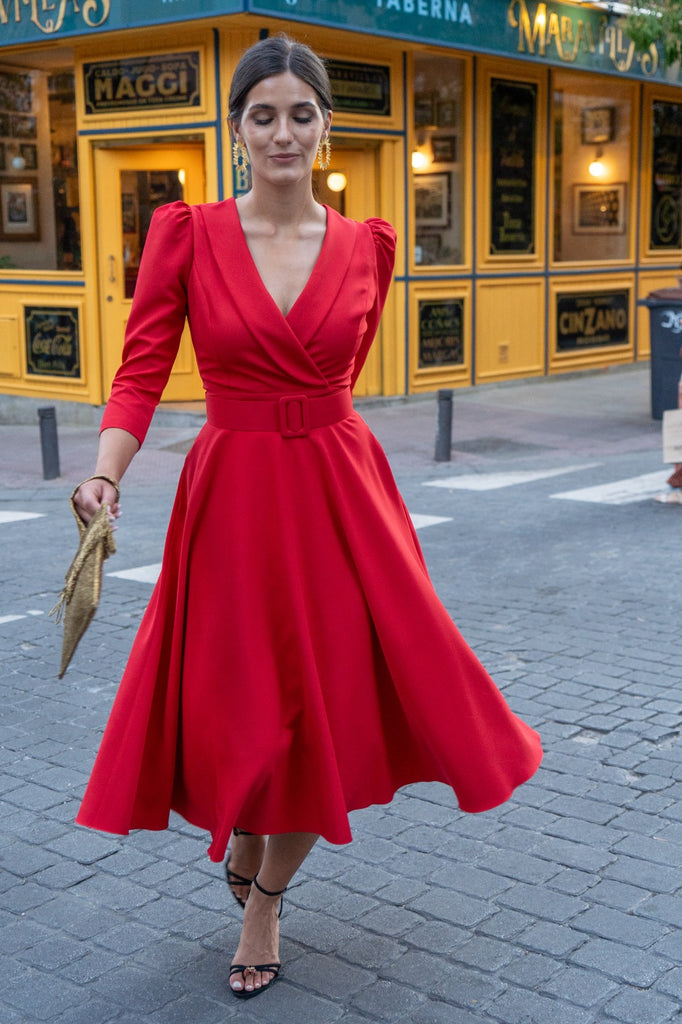 Midi dress with a crossover neckline and lapel collar, three-quarter sleeves, a belt, a flared skirt, and pockets. In red.