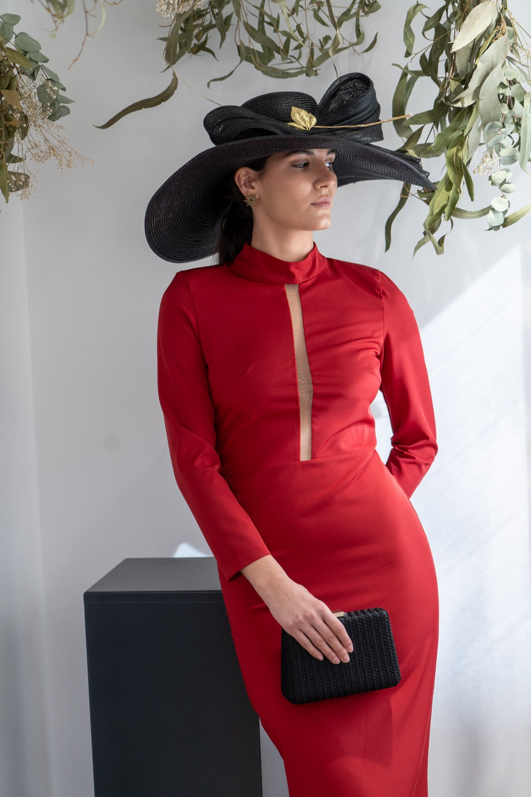 Midi dress, high round neckline with sheer strap, three-quarter sleeves, back slit. In red.