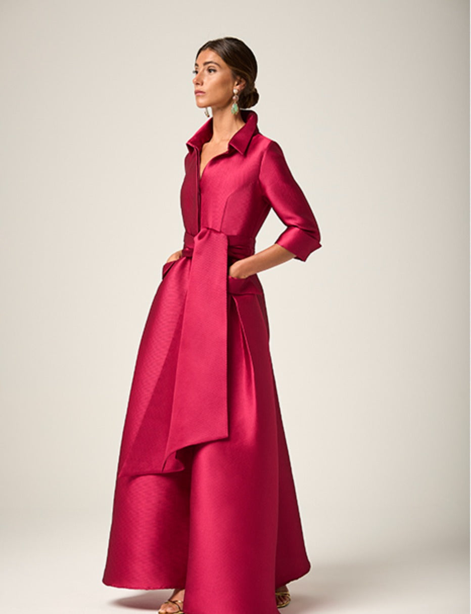 Long dress, shirt collar, three-quarter sleeves with cuffs, fully buttoned at the front, side pockets, maxi bow at the waist. In pink mikado fabric.
