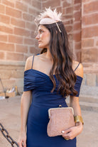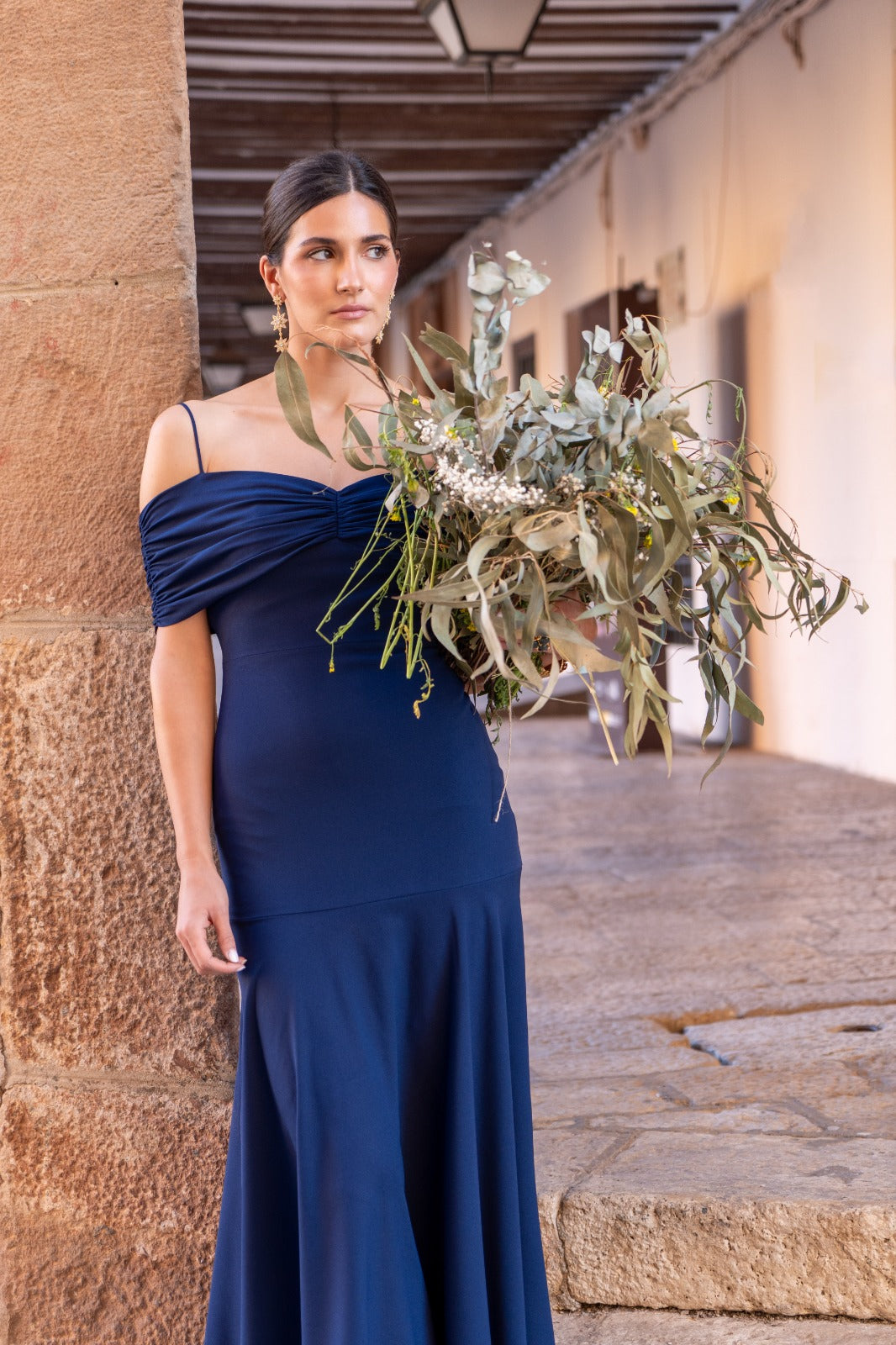 Midi dress made of light crepe with a bardot neckline with a draped piece that wraps around the body and arms, cut below the hip with a cape skirt. In blue.