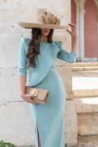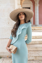 Midi dress, round neckline, long sleeves, ruffle on one side of the chest, front slit. In green.