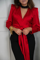 Blusa en saten, escote a pico, manga larga con puño abotonado, anudada delante. En color rojo.