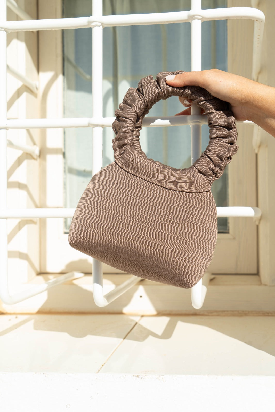 Bolso con asa redonda rizada, forrado en seda natural, en color marron.
