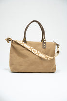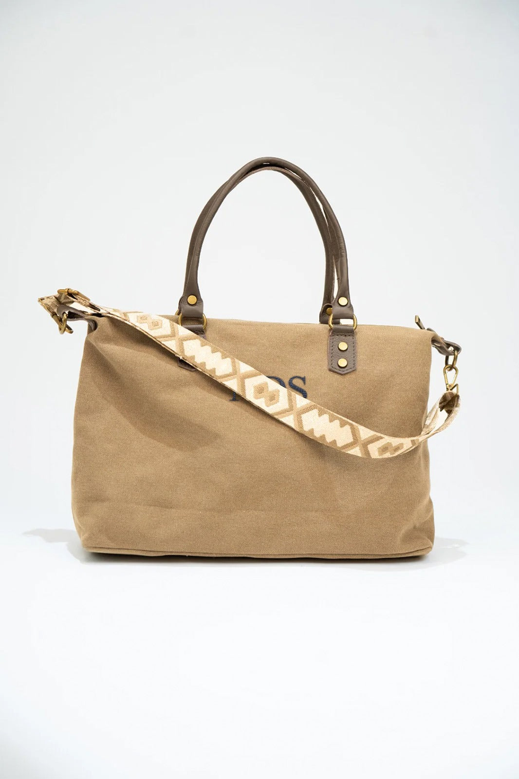Bolso en loneta, con asas fijas en piel y correa extraíble y ajustable de algodón en color marrón chocolate. Cierre con cremallera, forro interior en negro y bolsillo interior. En color tierra.