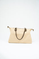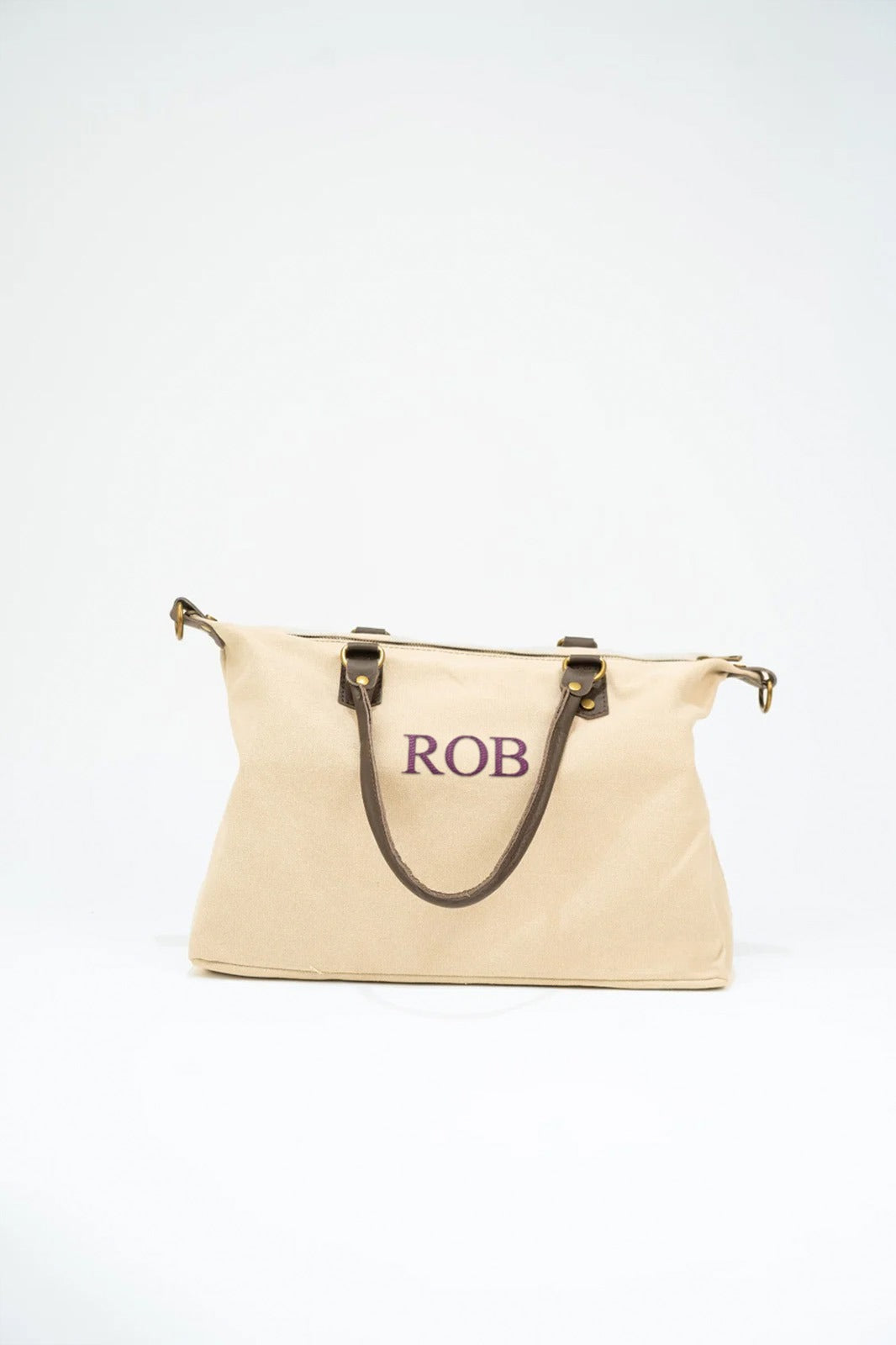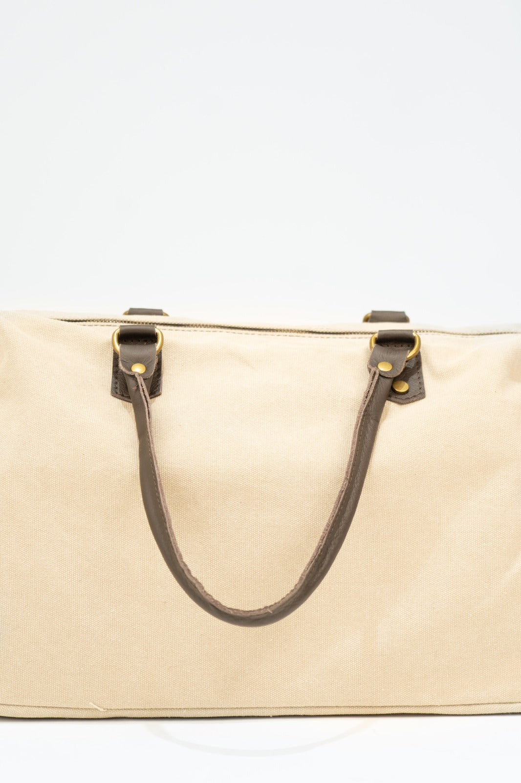 Bolso en loneta, con asas fijas en piel y correa extraíble y ajustable de algodón en color marrón chocolate. Cierre con cremallera, forro interior en negro y bolsillo interior. En color beige.