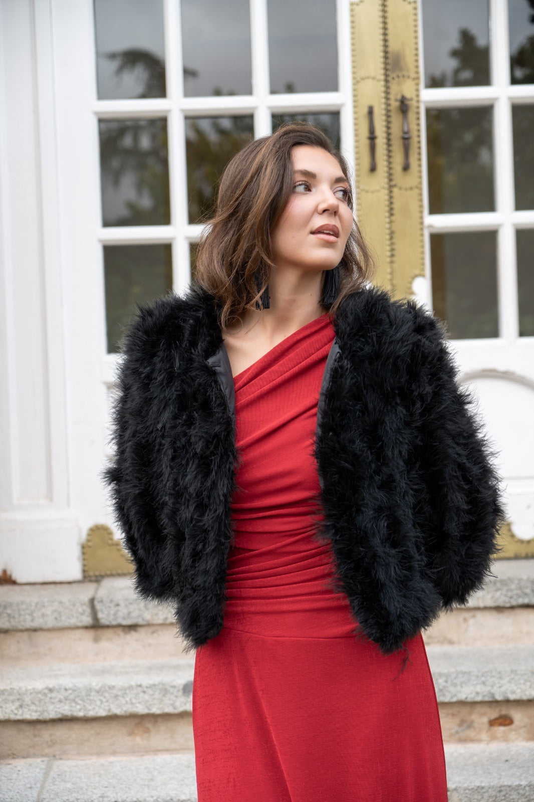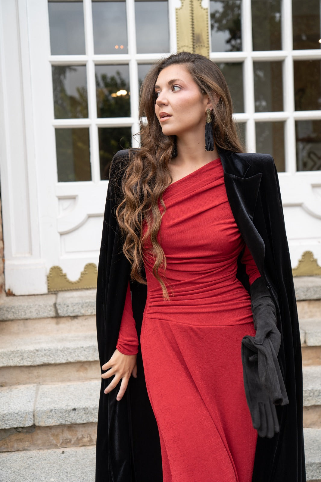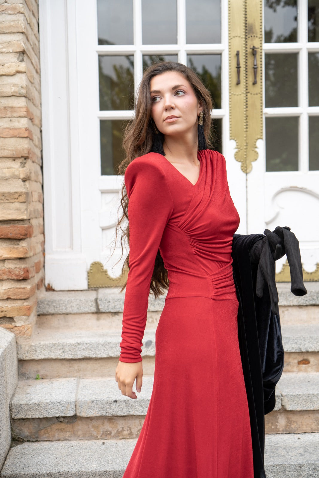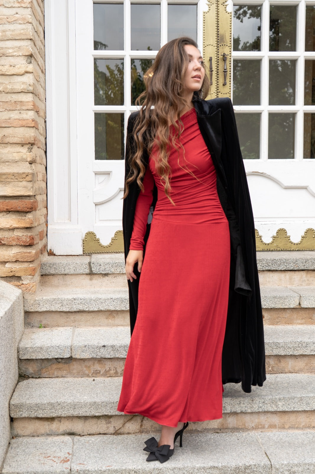 Vestido de punto con manga larga, cuerpo drapeado dejando el escote asimétrico, falda de capa. En color rojo.