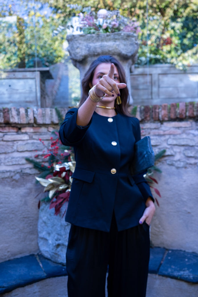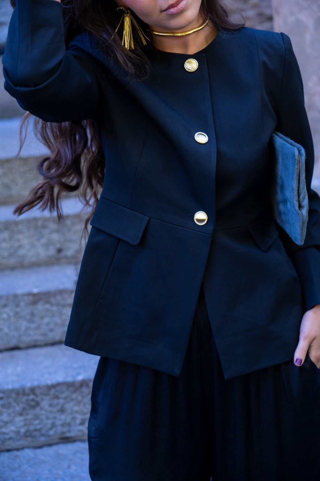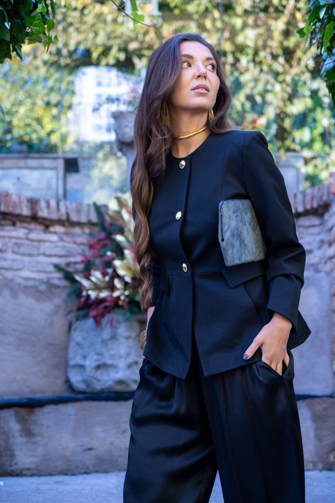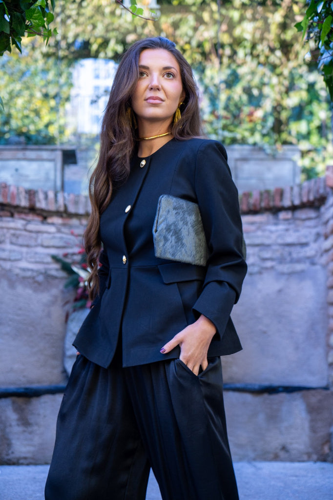 Chaqueta cuelo mao, abotonada, bolsillos laterales, tapetas delanteras en color negro.