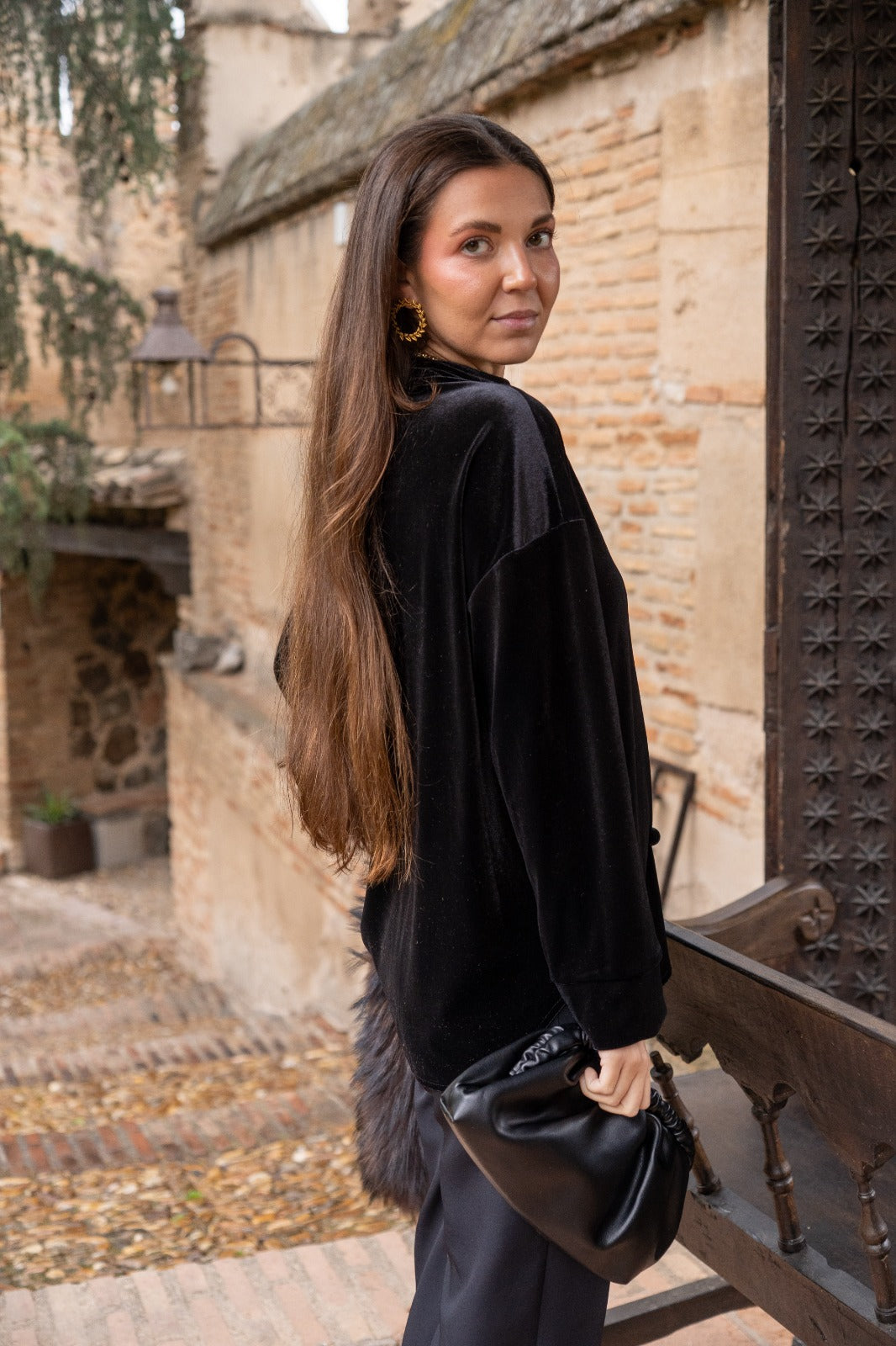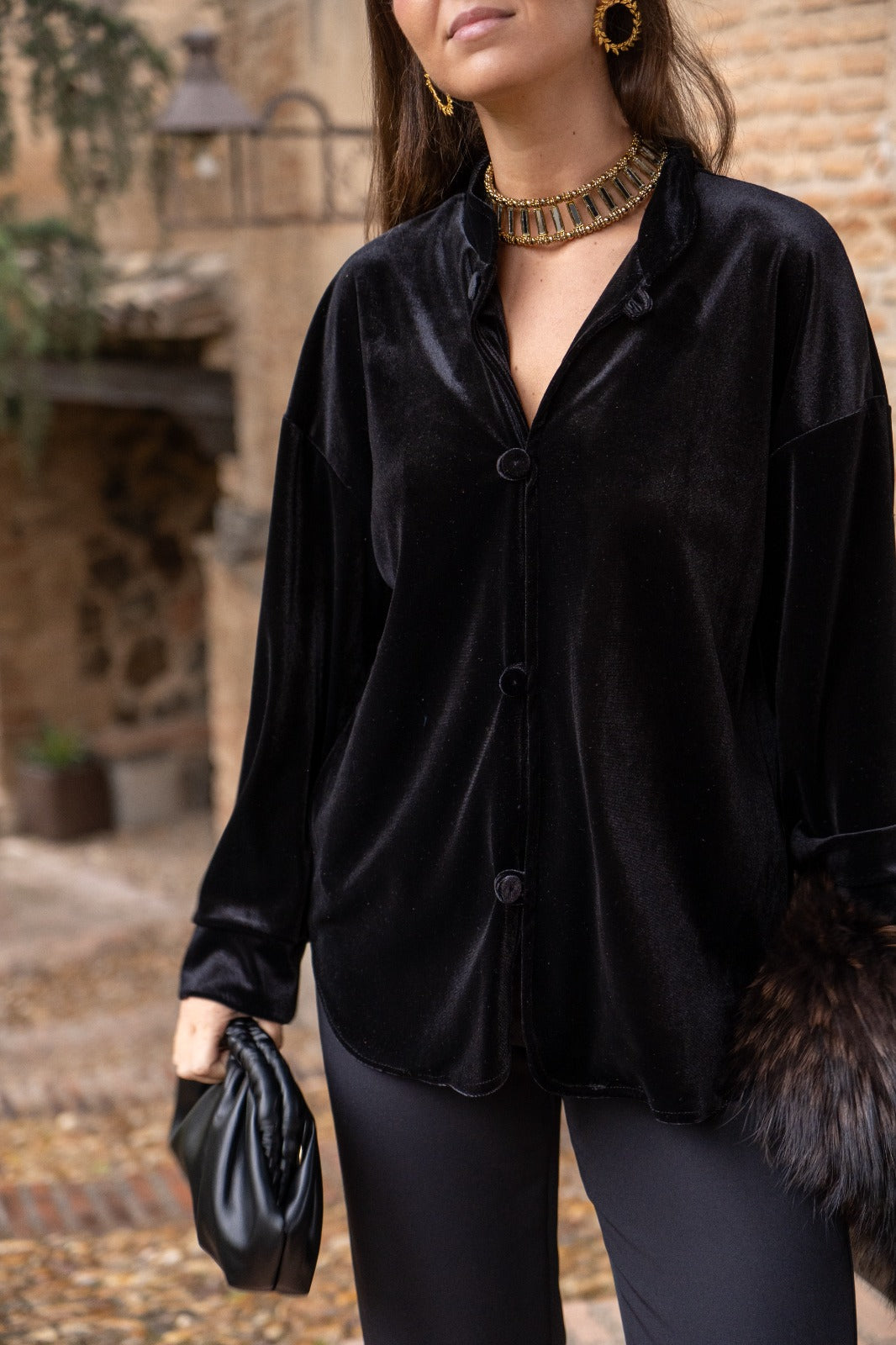 Chaqueta cuello mao, manga larga con puño, abotonada, en terciopelo negro.
