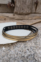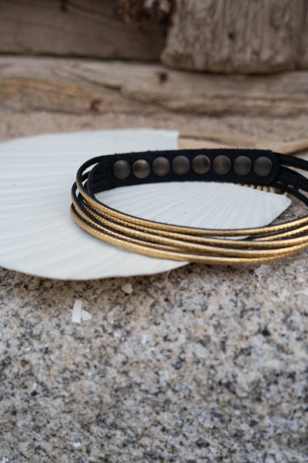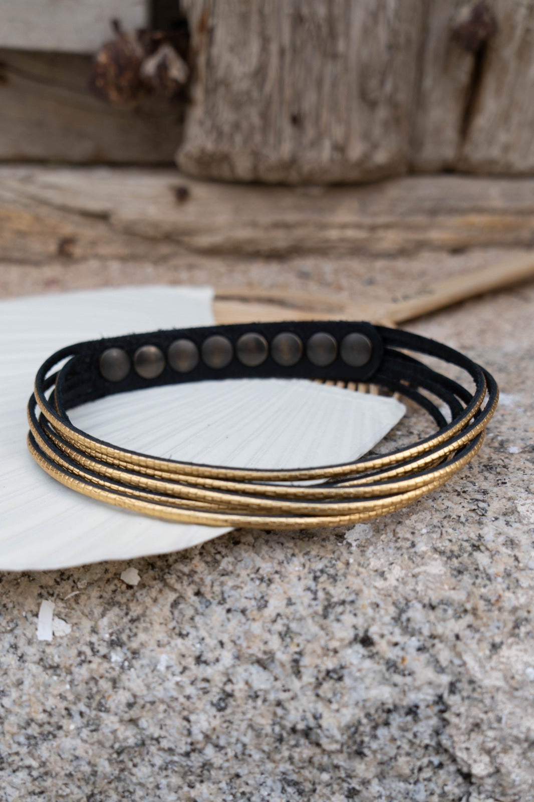 Colgante en piel, formado por varias tiras de una piel metalizada grabada, varias posiciones para abrochar. En color dorado.