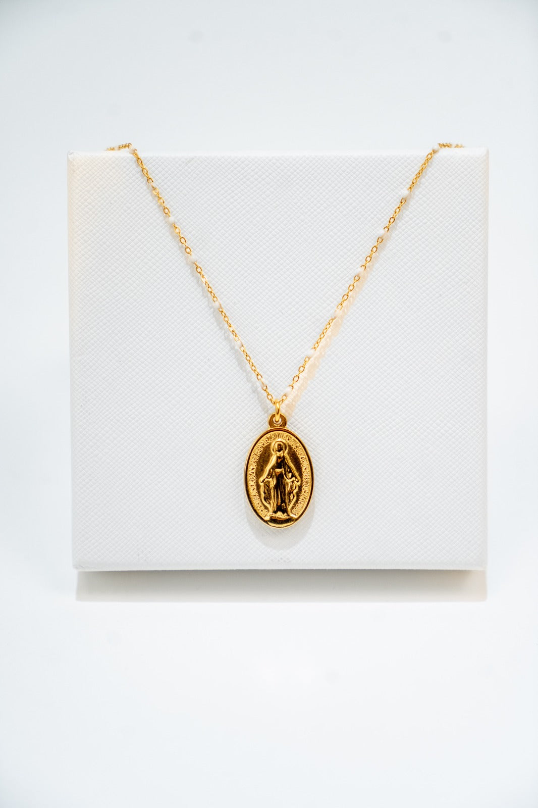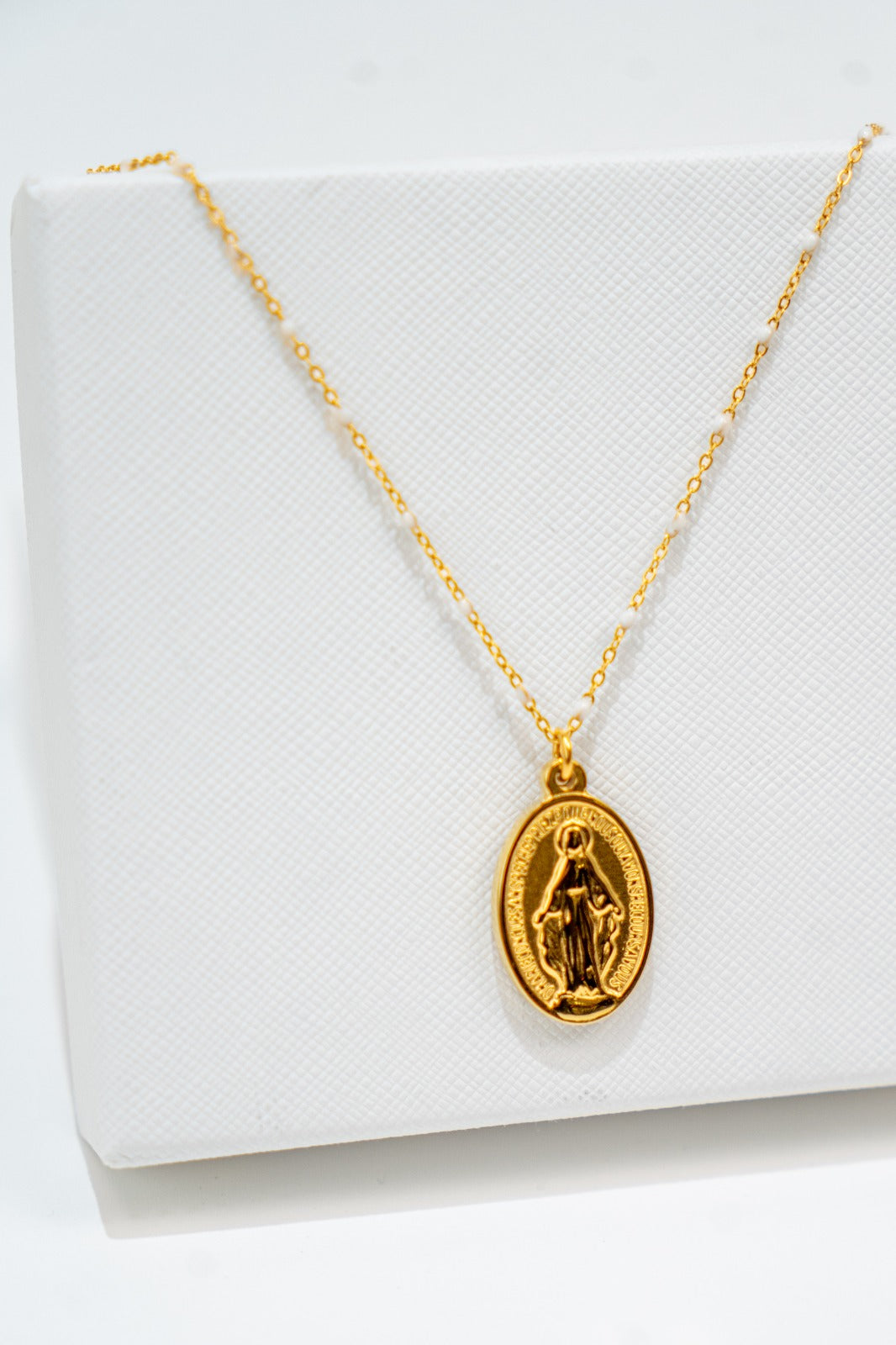Colgante con cadena con detalle bolas blancas y medalla con relieve.