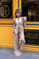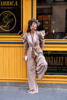 Conjunto compuesto por chaqueta con solapa, cruzada con cinturón, manga abullonada y pantalón tiro alto ancho. En color beige.