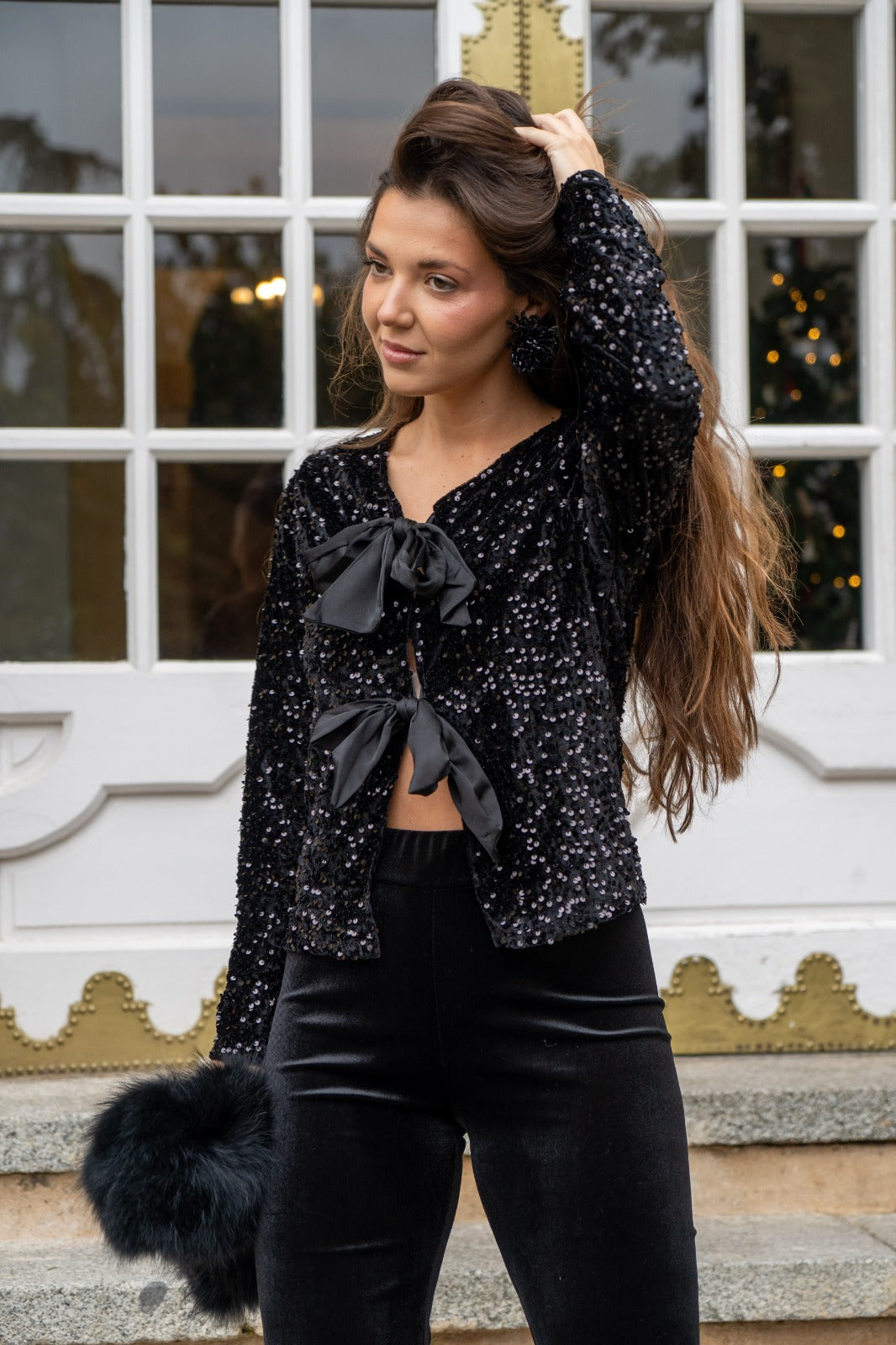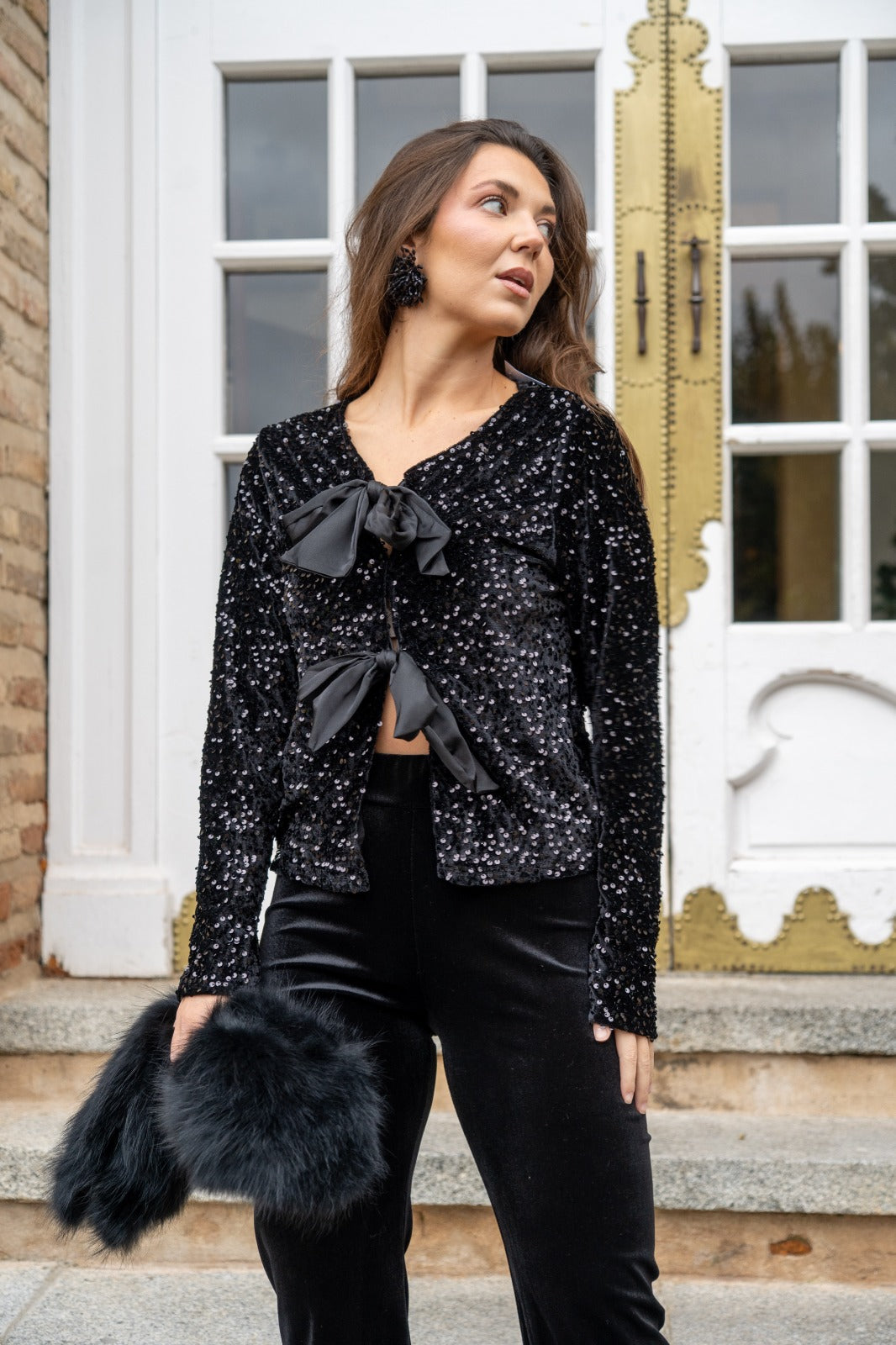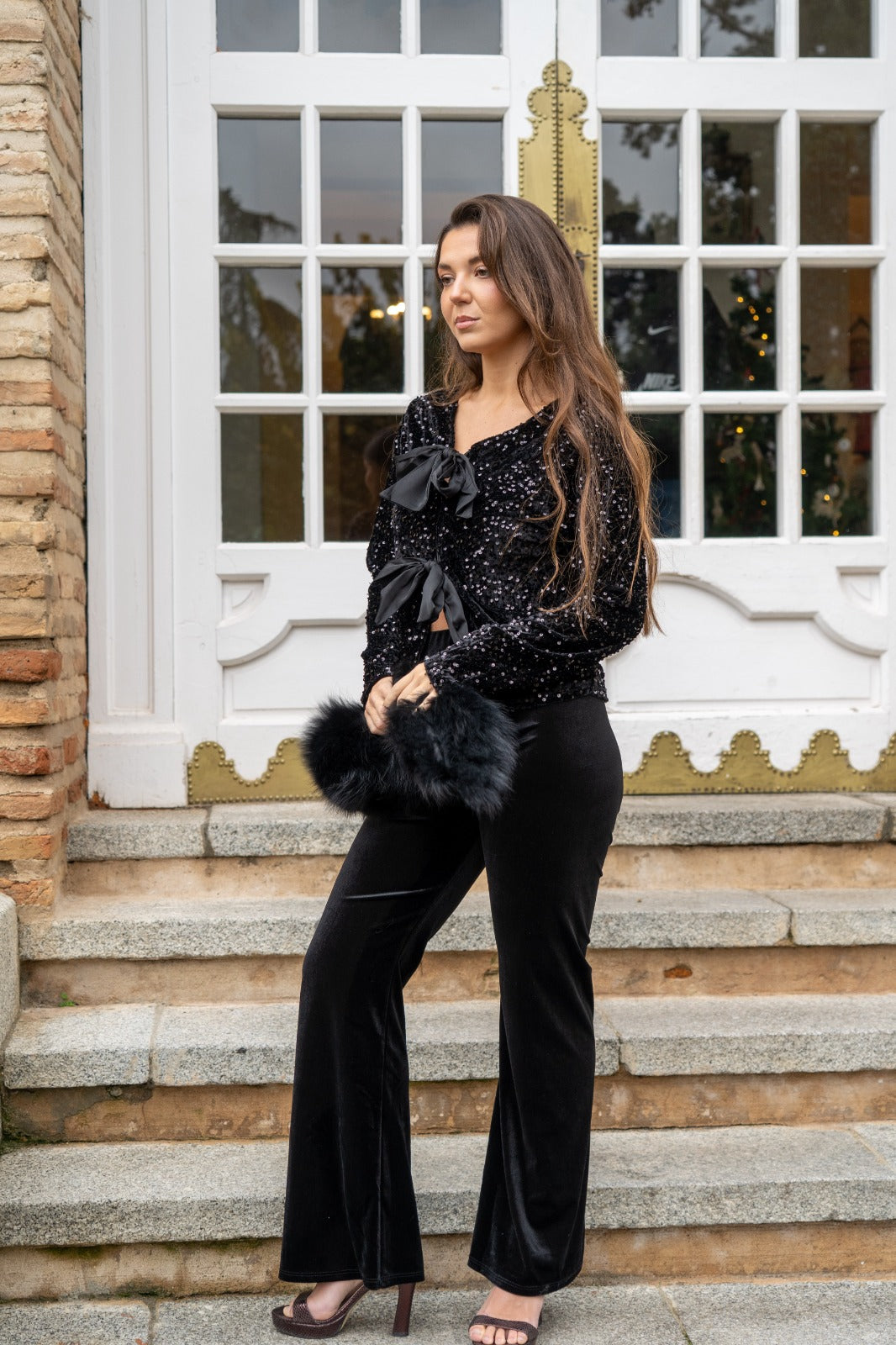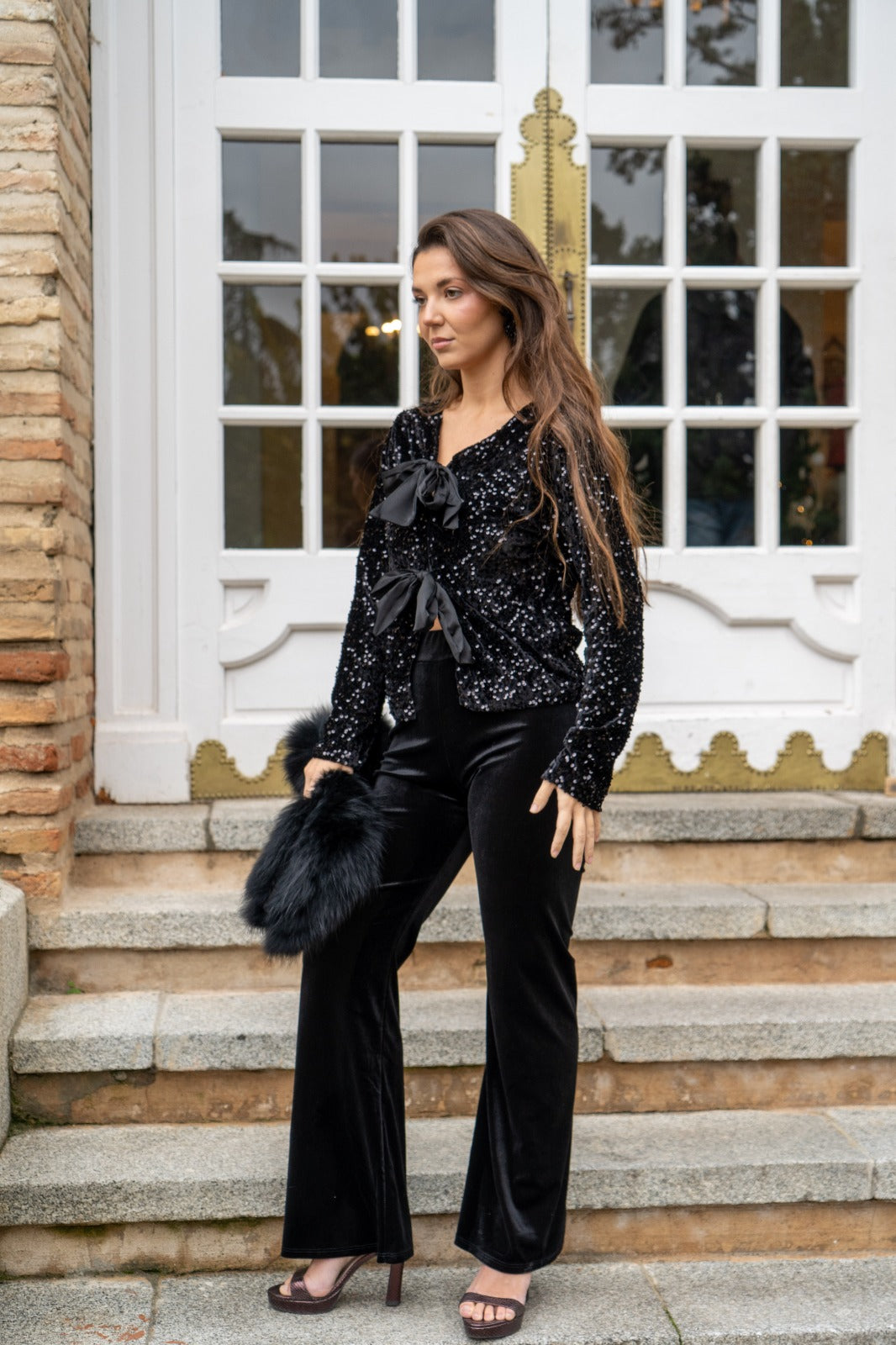 Conjunto compuesto por blusa, escote a pico, manga larga, abrochada con lazos y lentejuelas negras. Pantalón cintura engomada, ancho, en terciopelo negro.