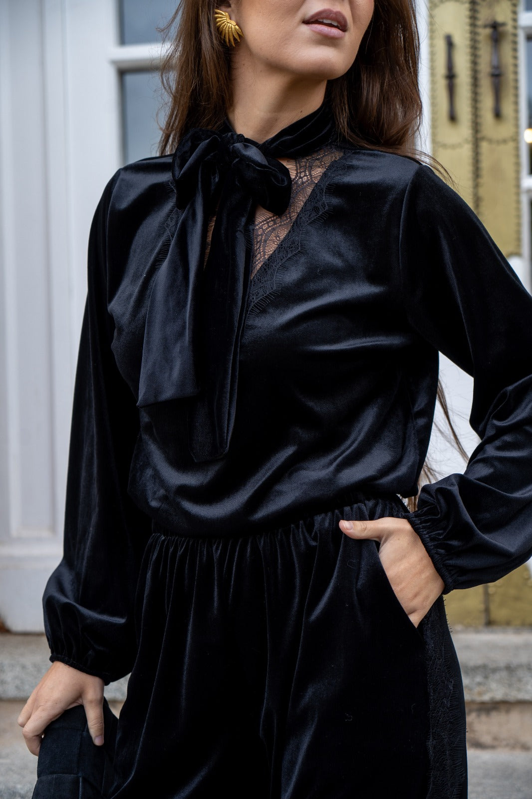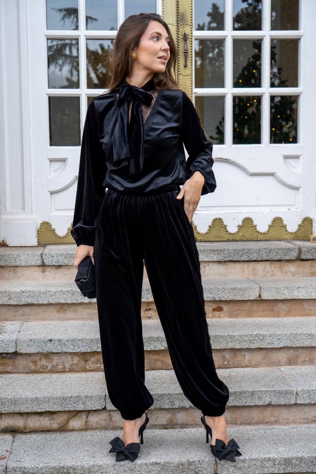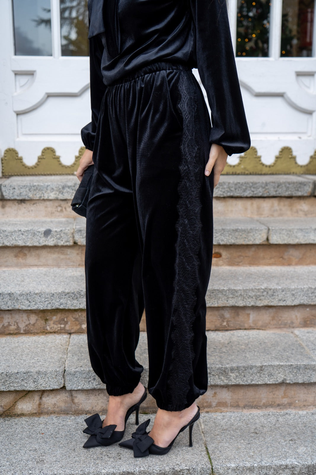 Conjunto compuesto por blusa, escote a pico con puntilla, manga larga con puño engomado y pantalón bombacho, cintura engomada, puntilla en los laterales, en color negro.
