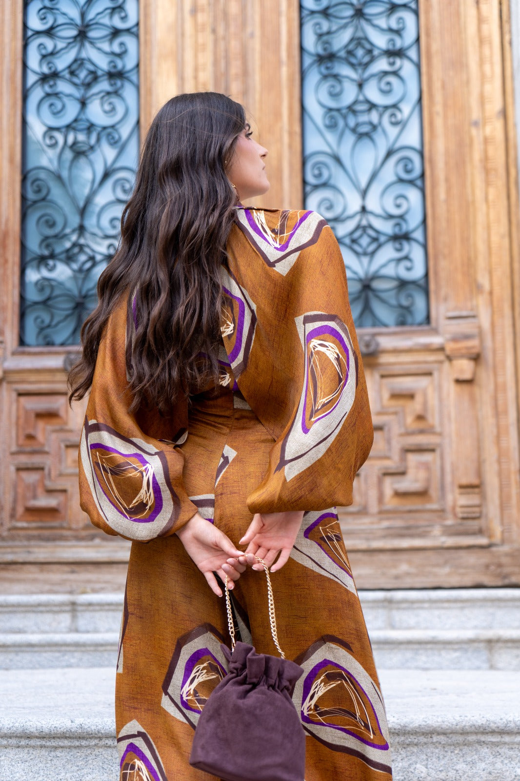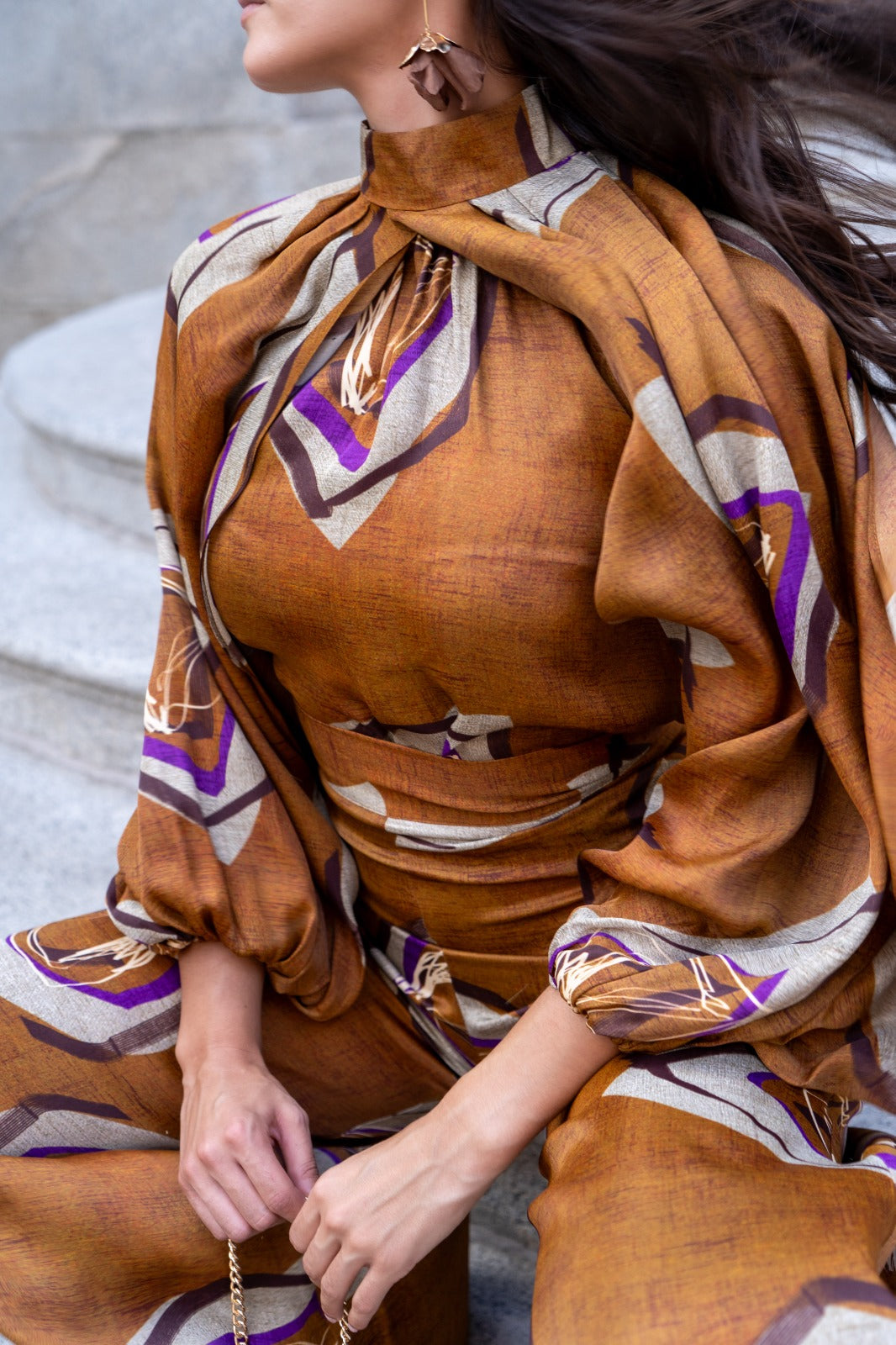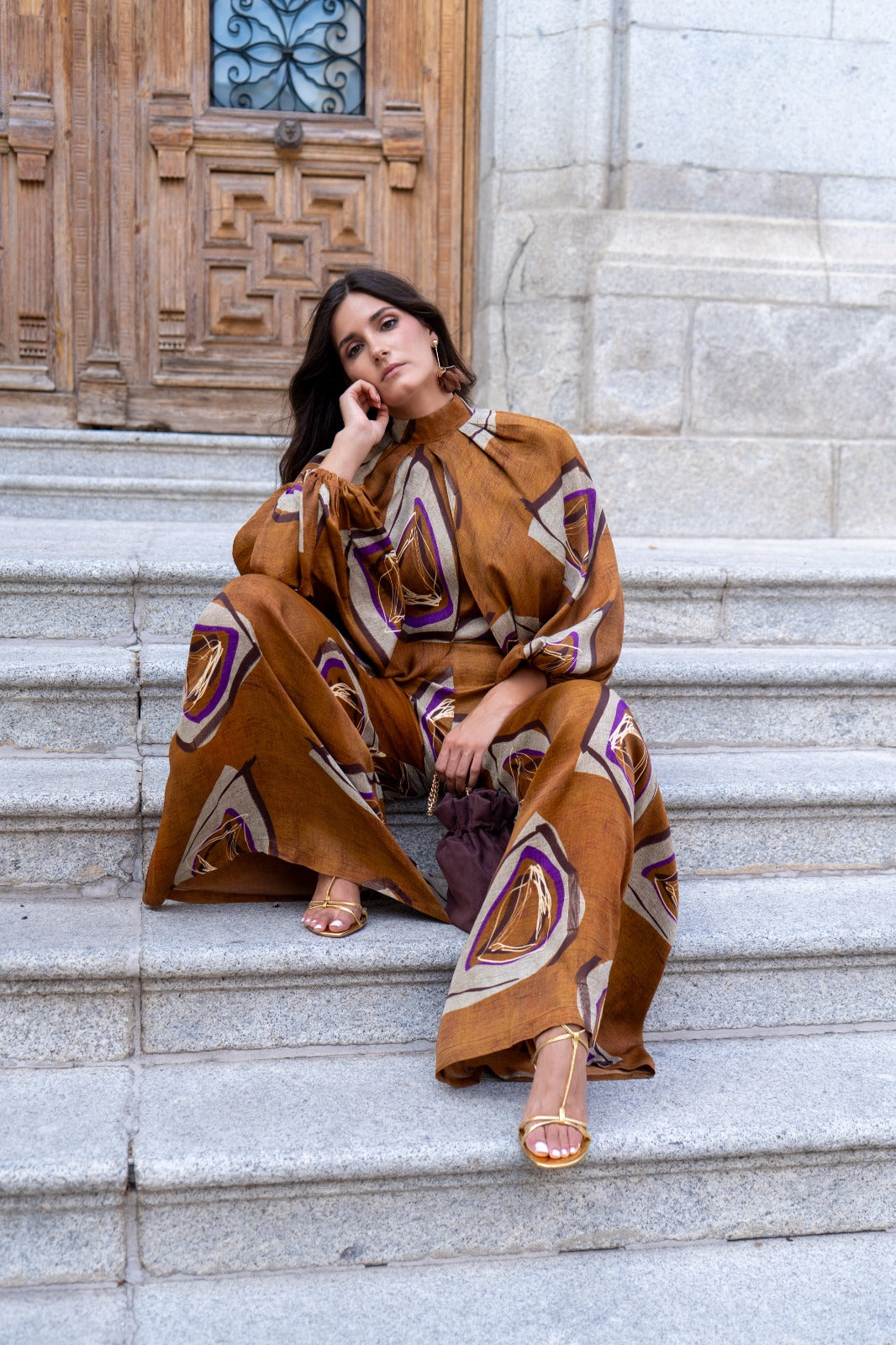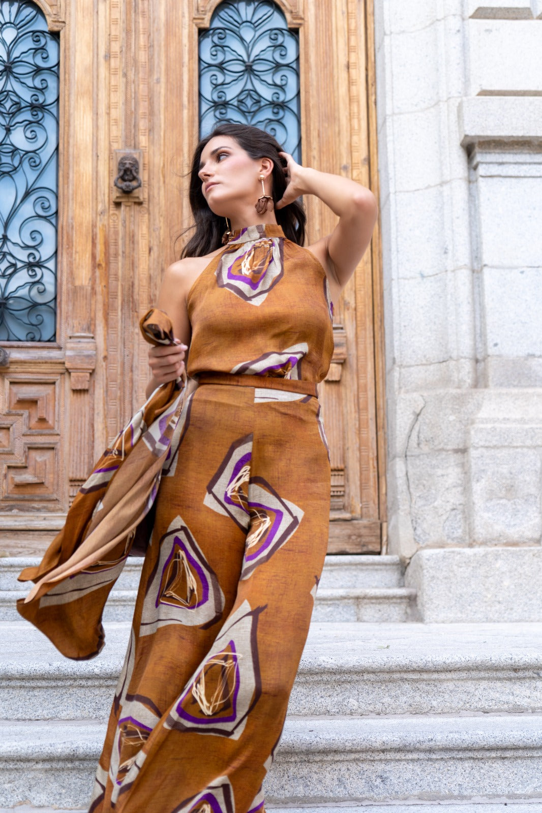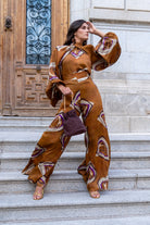 Conjunto compuesto por camisa cuello fruncido sin mangas, camisa por encima manga manga larga y pantalón cintura alta, ancho. En color marrón con estampado.