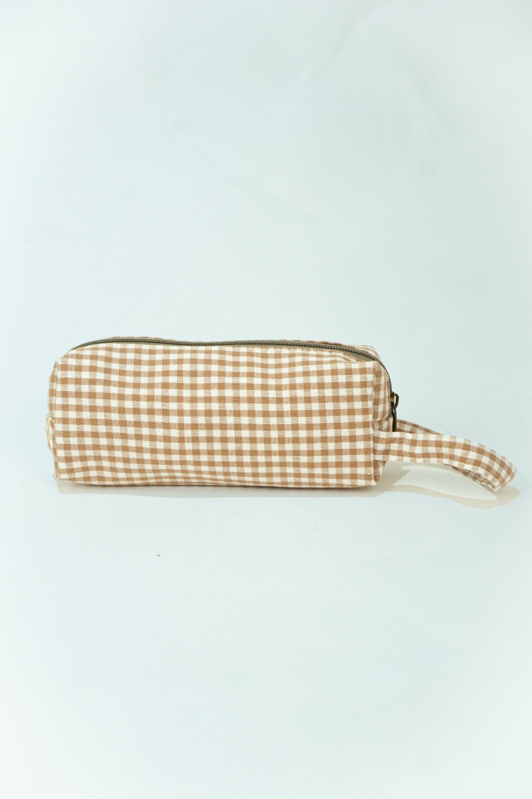 Estuche o neceser pequeño, cierre con cremallera, asa a un lado. En vichy blanco y marrón.