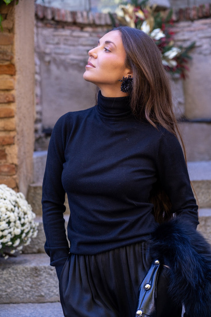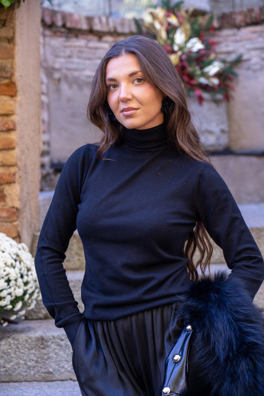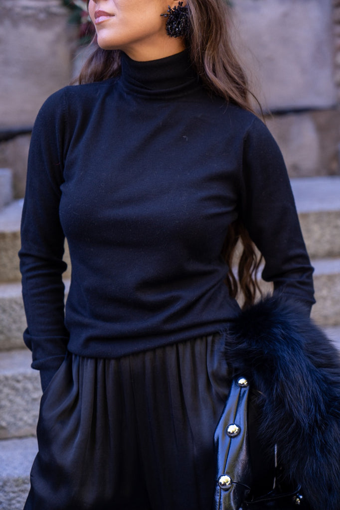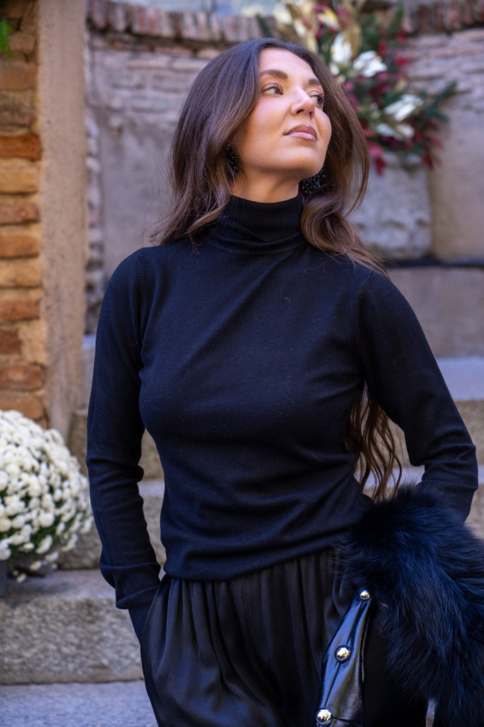 Jersey suave, cuello vuelto, manga larga, entallado en color negro.