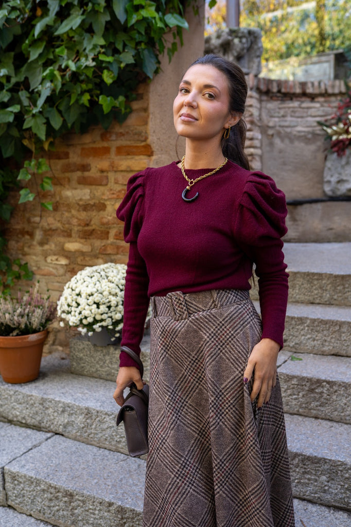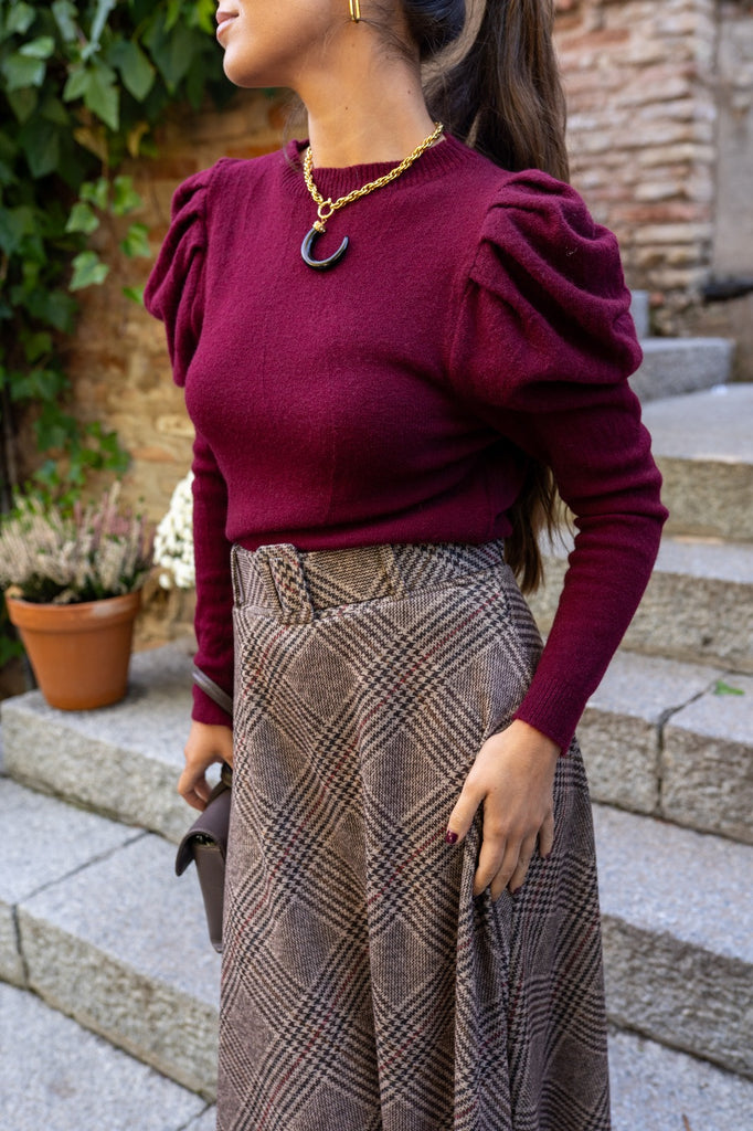 Jersey suave, manga larga, escote redondo, manga abullonada, en color burdeos.