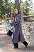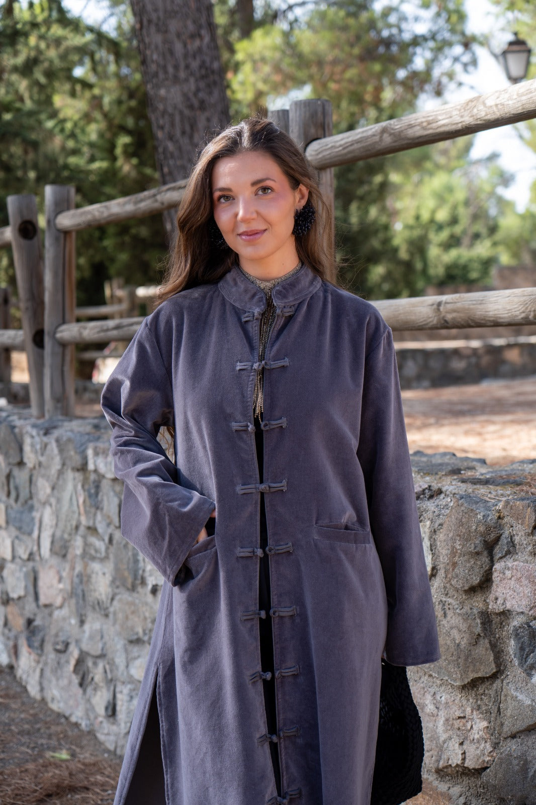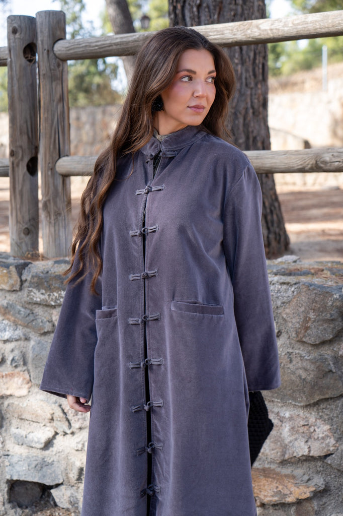 Kaftan recto, aberturas a los lados, manga larga, bolsillos delanteros. En terciopelo color gris.