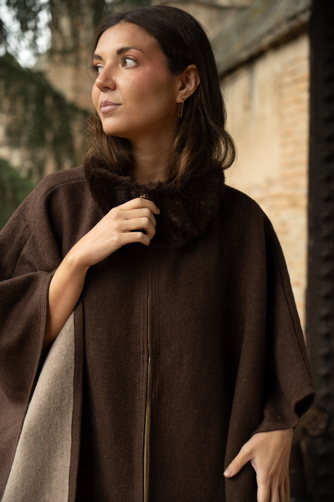 Poncho en tejido gordito, aberturas laterales, cuello y parte de abajo en pelo, en color marrón.