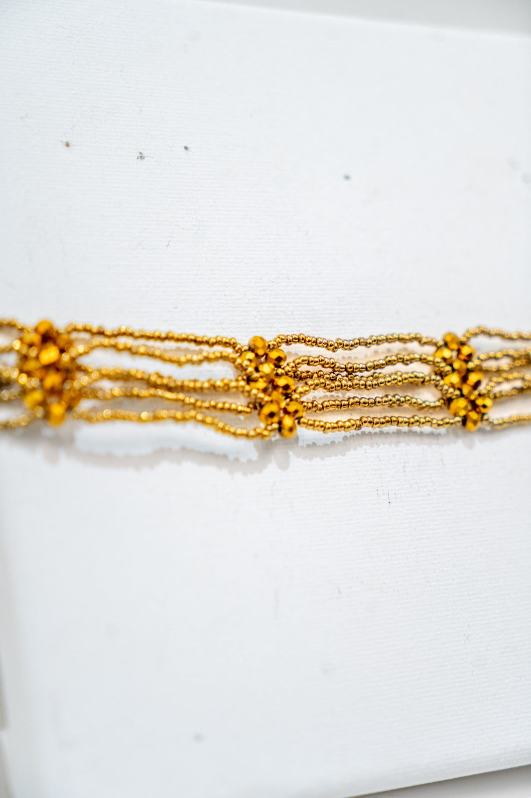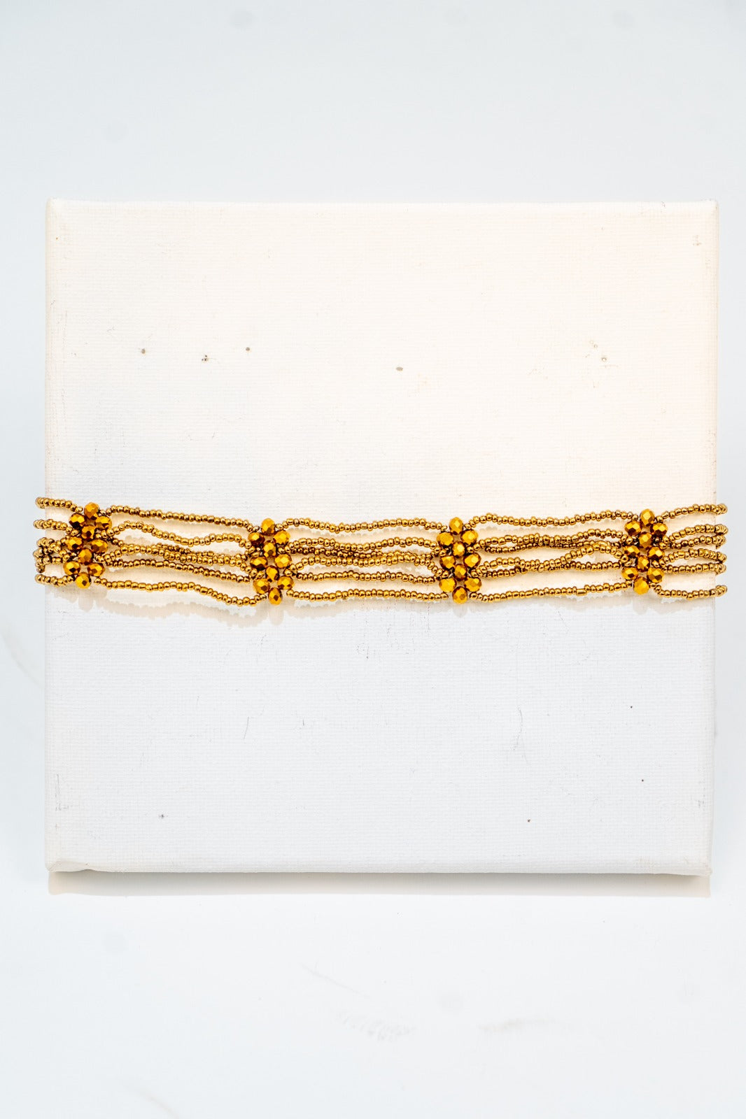 Choker formado por hileras con detalles de piedras, en color dorado.