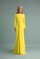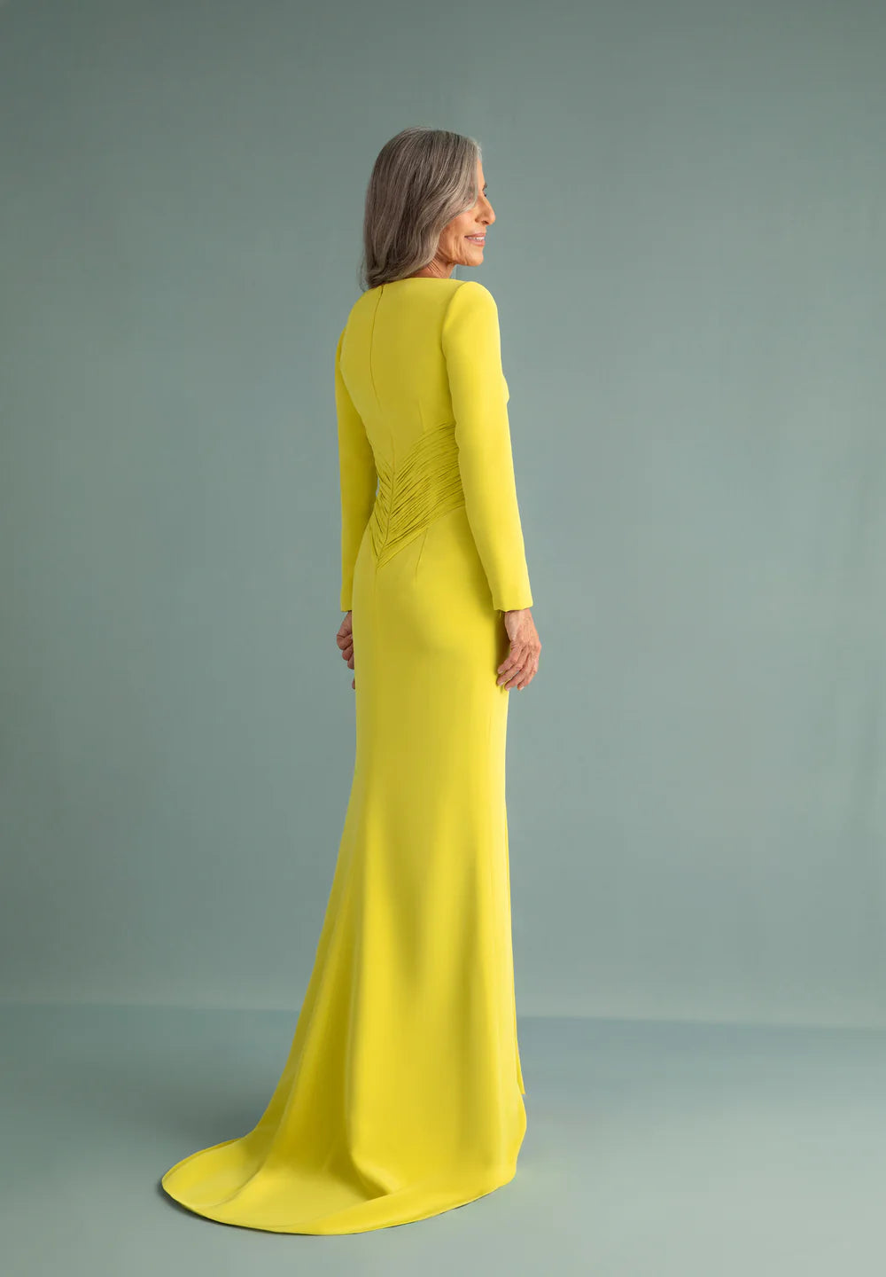 Vestido en triacetato con escote barco y manga larga. Pieza de gasa drapeada al tono que rodea la cintura y nace del centro delantero un corbatín que cae hasta el suelo. Dos opciones de color, lima y coral.