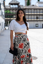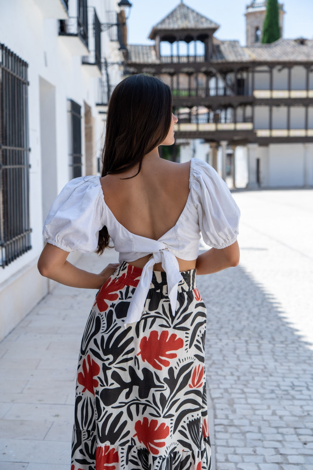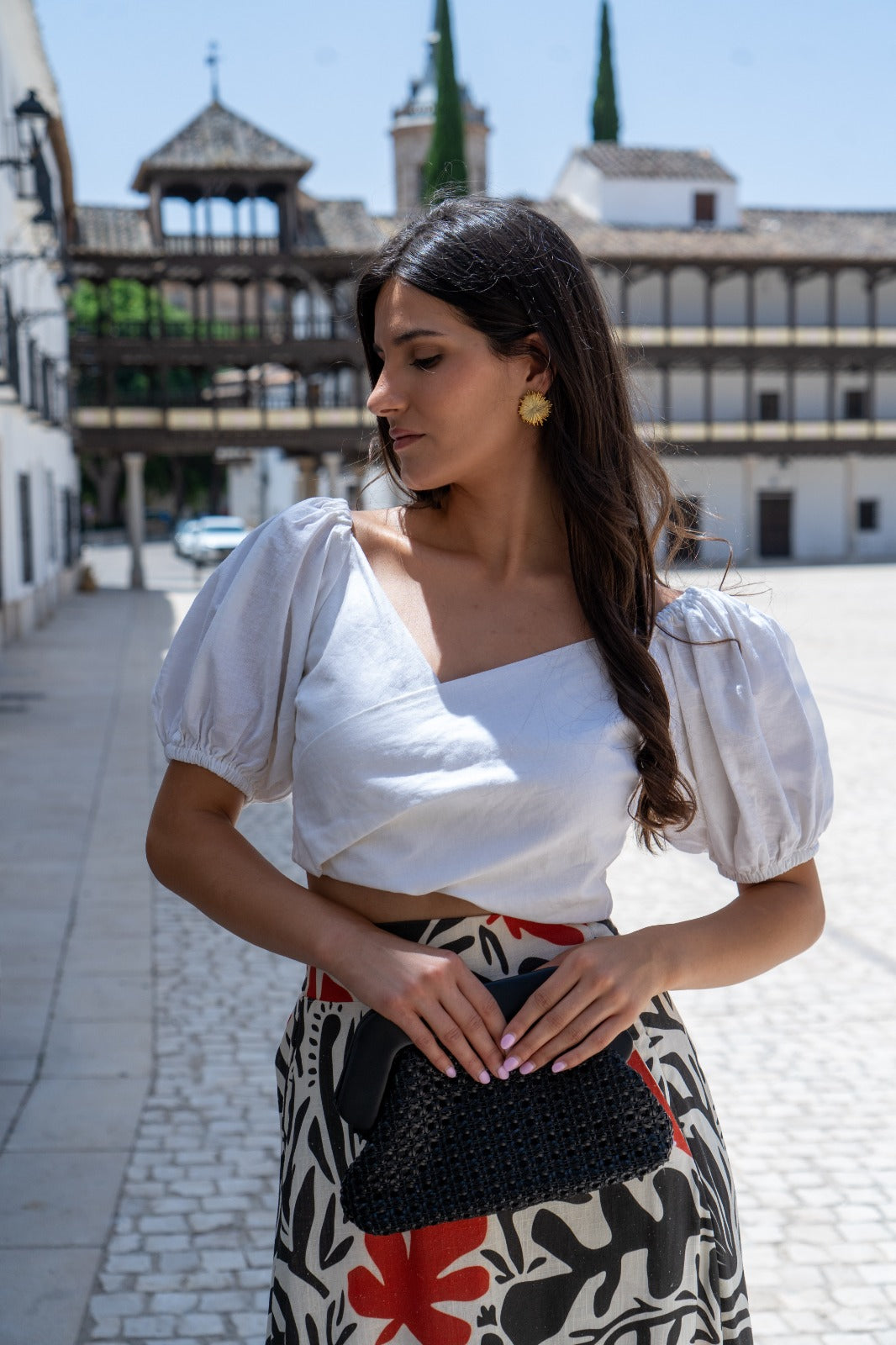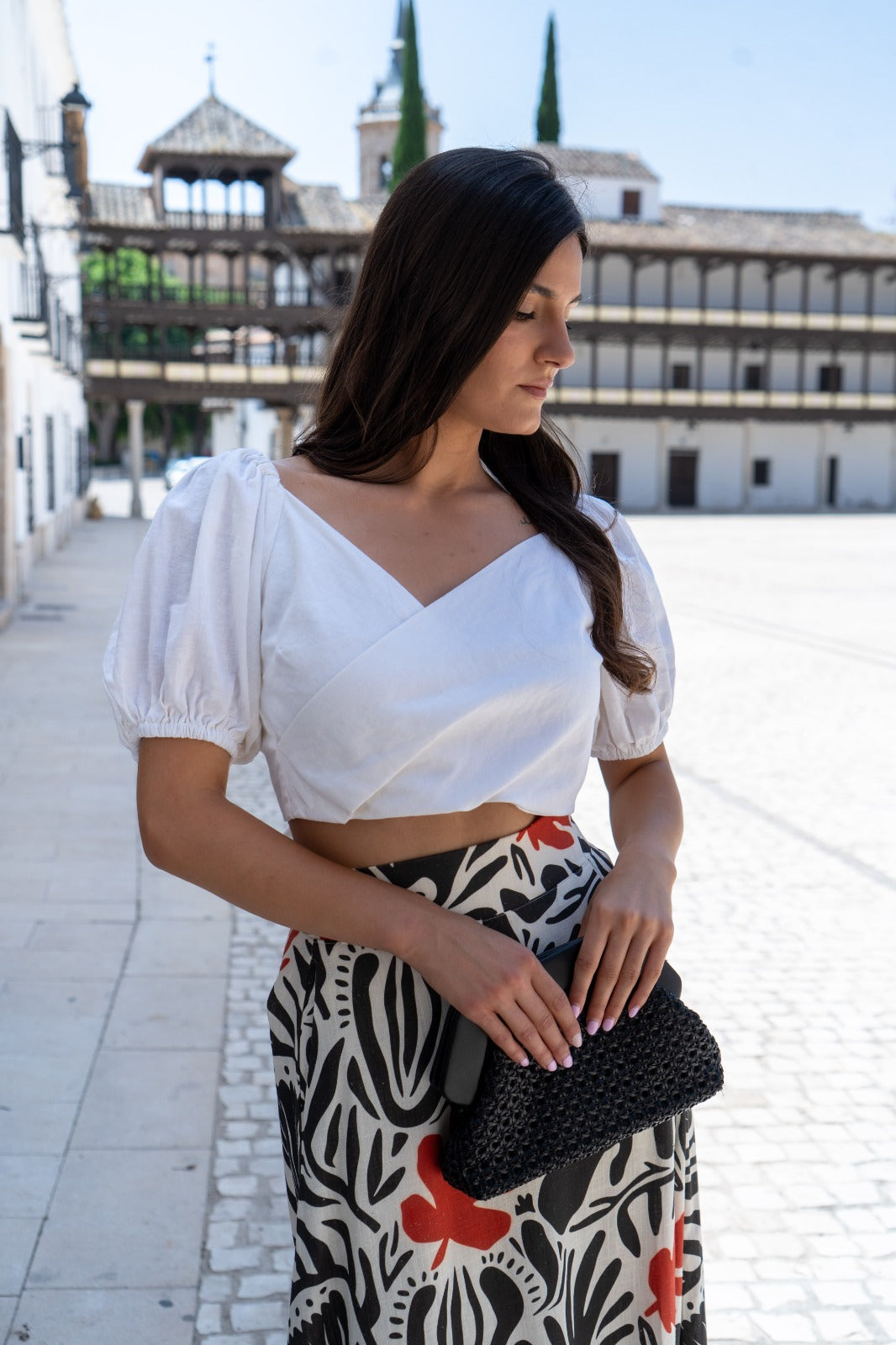 Top cruzado, anudado, manga corta con goma. En color beige, tipo lino.