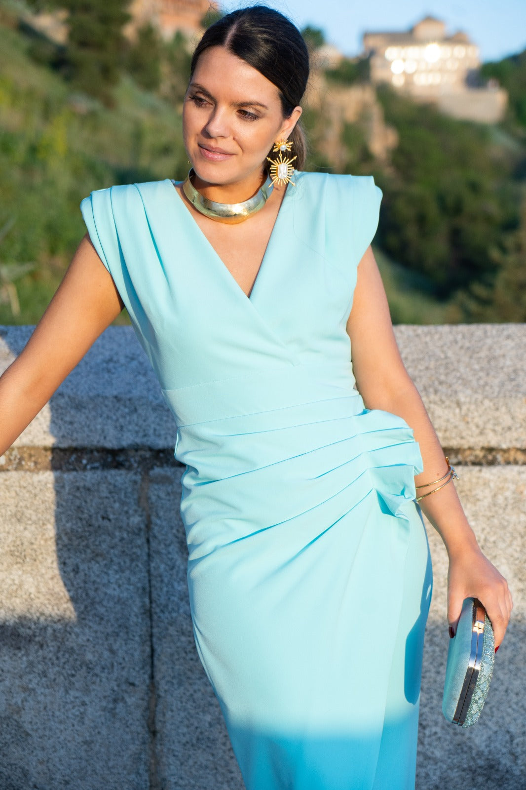 Vestido midi, escote cruzado, sin mangas, hombrera alta con pliegues, abertura delantera lateral con volante. En color verde.