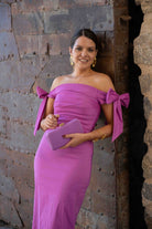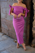 Vestido midi en tafeta elástica con cuerpo drapeado y lazadas que hacen de manga envolviendo los brazos, corte en la cintura con falda recta. En color malva.