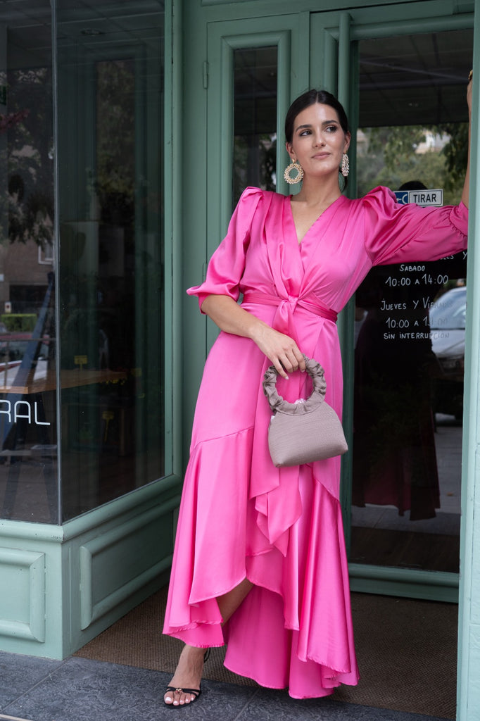 Vestido midi, fluido, cruzado con nudo, media manga y puño, forma delantera, mas largo de detrás. En color rosa.