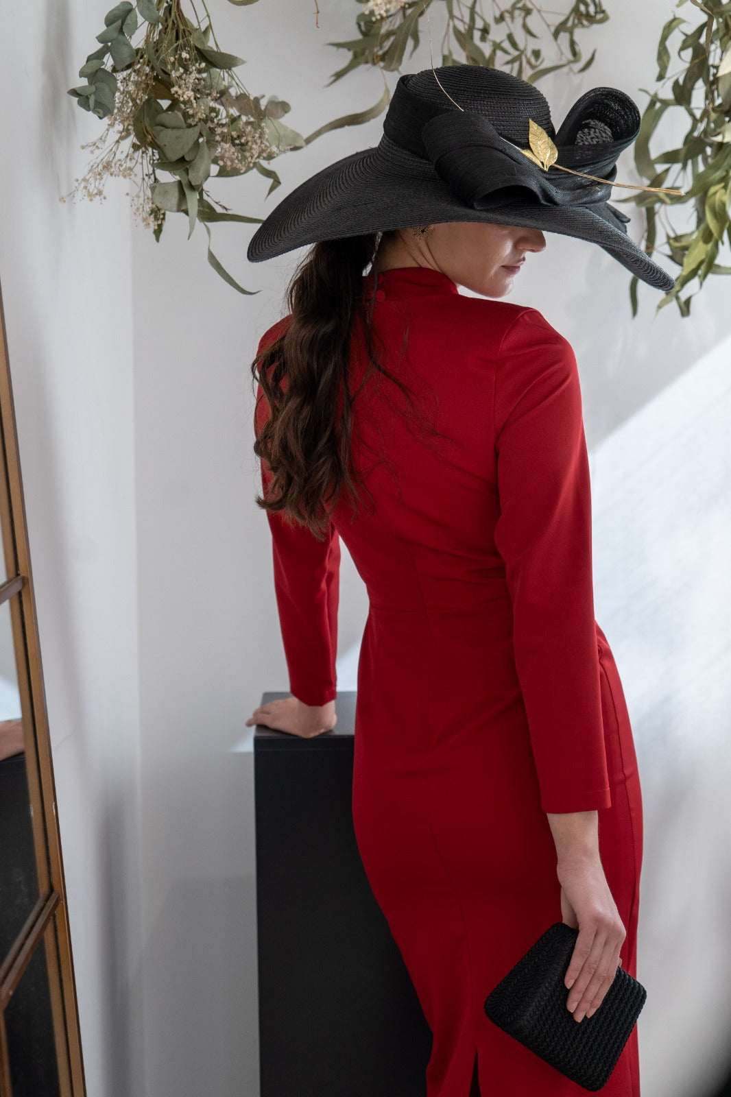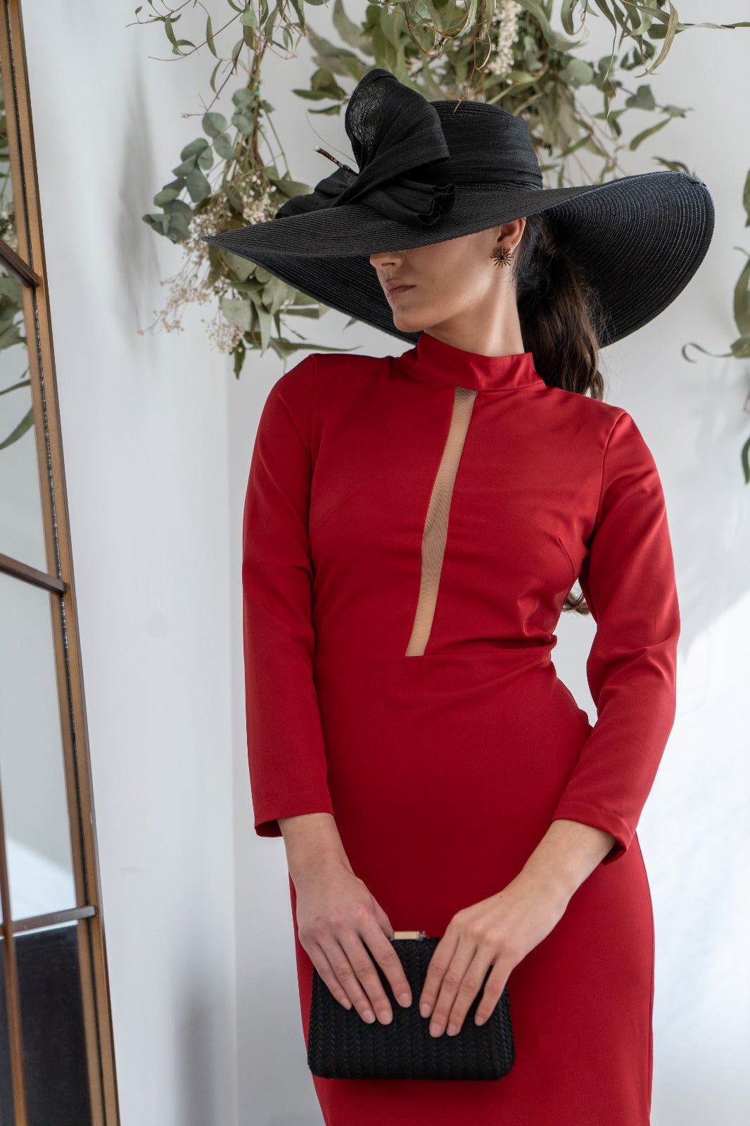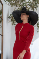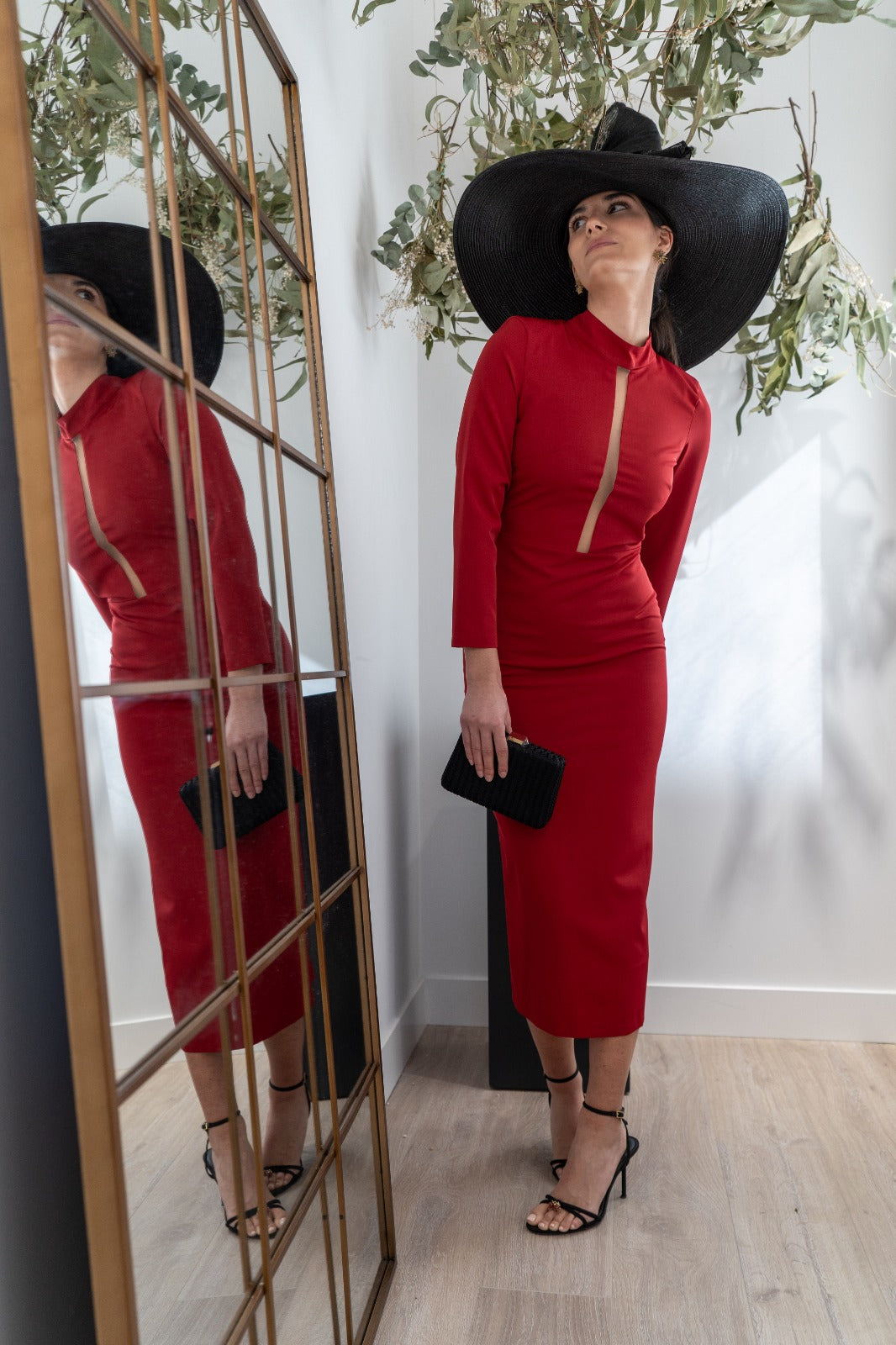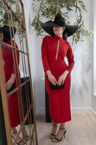 Vestido midi, escote redondo subido con tira transparente, manga francesa, abertura trasera. En color rojo.