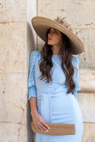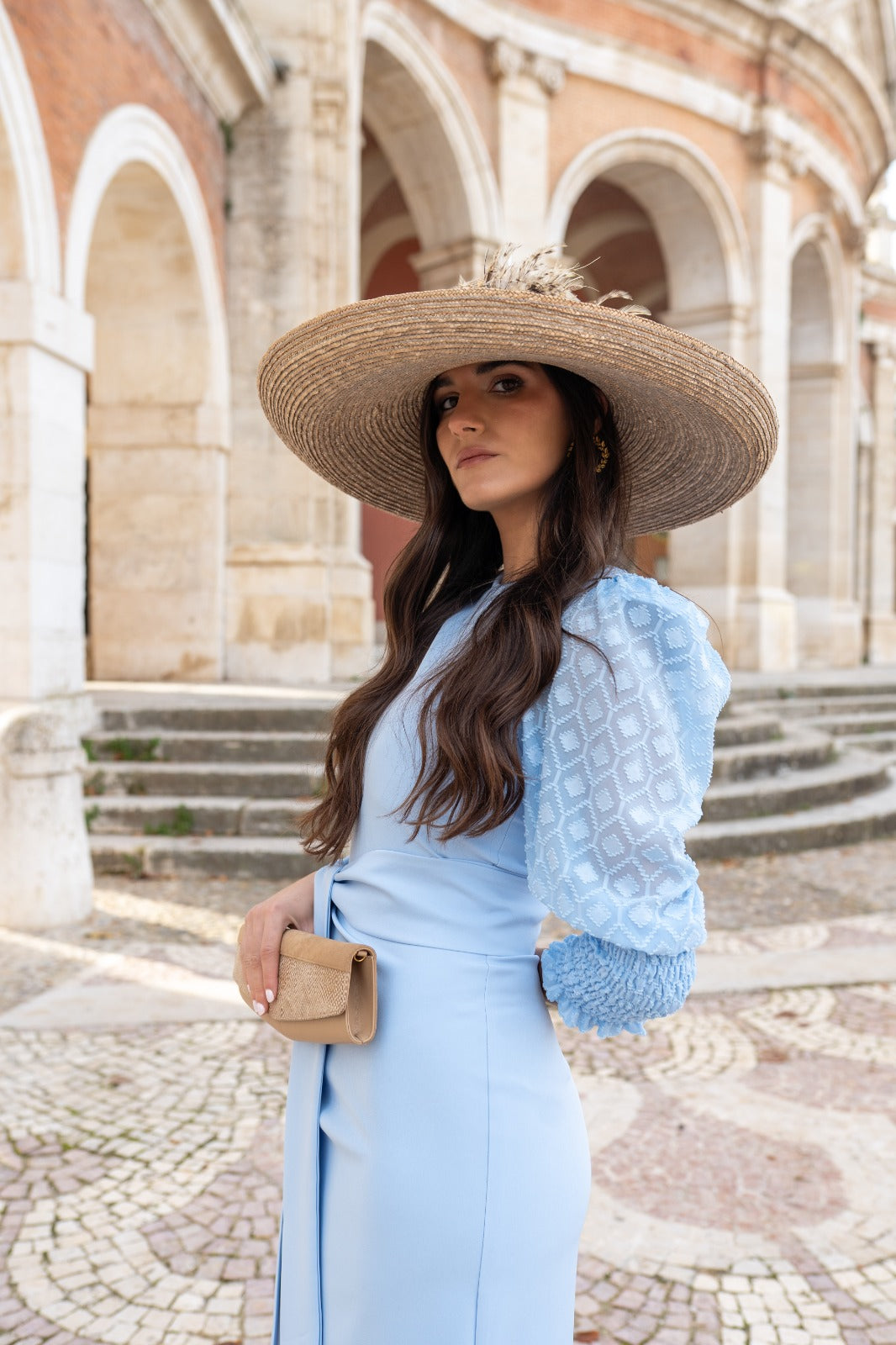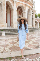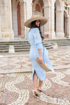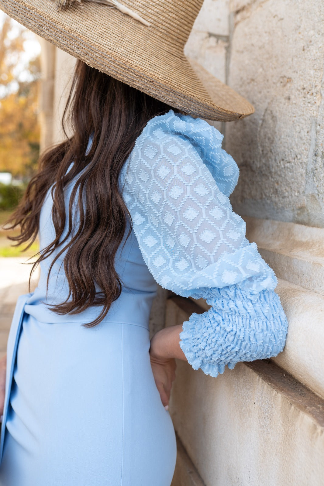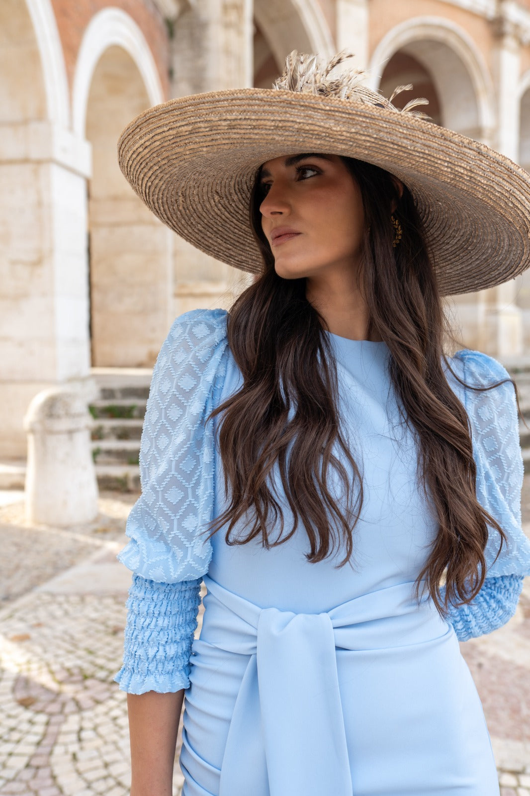 Vestido midi, escote redondo, manga plumeti con puño fruncido, abertura trasera, cinturón incluido. En color azul.