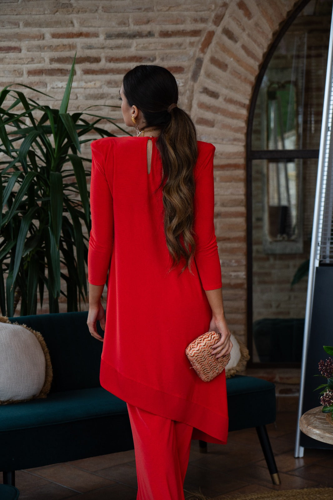 Conjunto compuesto por casaca escote redondo, manga larga, asimetrica y pantalon ancho, con cintura engomada. En color naranja.